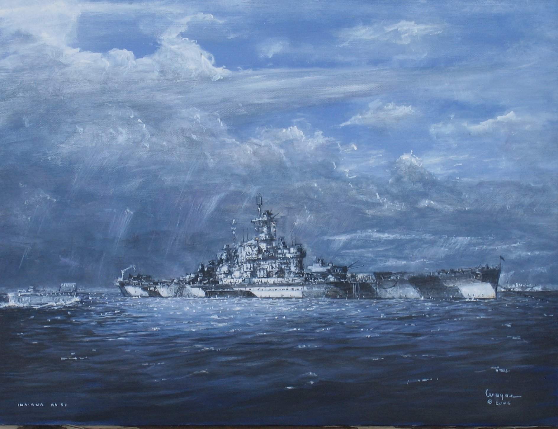 79k | Oil on canvas painting by the artist Anthony Saunders, entitled "Indiana (BB-58), First Tour of Duty". | Text and drawing courtesy of naval-art.com | |