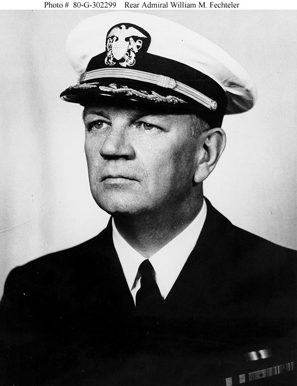 61k | Captain William M. Fechteler commanded the battleship Indiana (BB-58) in the Pacific in 1943. Promoted to the rank of Rear Admiral in early 1944, he was Commander of the Seventh Fleet's Amphibious Group 8 from August 1944 to March 1945, participating in landings at Morotai, Leyte, Lingayen and elsewhere in the Philippines. USN Portrait photograph, taken circa 1944-45. | Official USN photo now in the collections of the National Archives as # 80-G-302299 & submitted by Bill Gonyo. | |