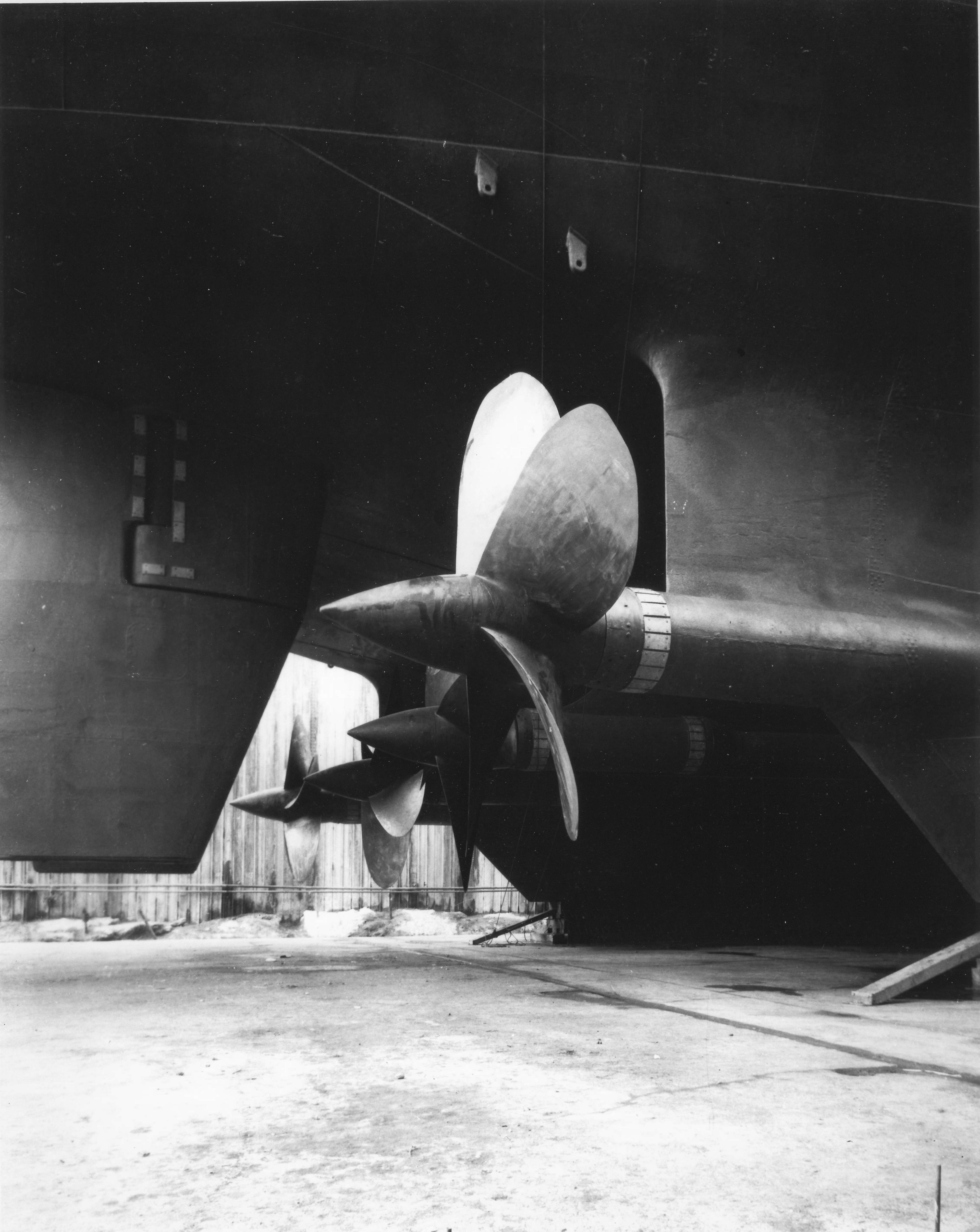 813k | View of the ship's stern, showing her twin outboard skegs, with five-bladed propellers at their after ends. Four-bladed inboard propellers are faintly visible, with the ship's twin rudders directly aft of them. Taken in drydock at the Newport News Ship Building and Drydock Company, Newport News, Virginia, 13 March 1942. | Text courtesy of photo Naval History and Heritage Command # NH 93910, from the collections of the Naval Historical Center. Photo courtey of Pieter Bakels. | |