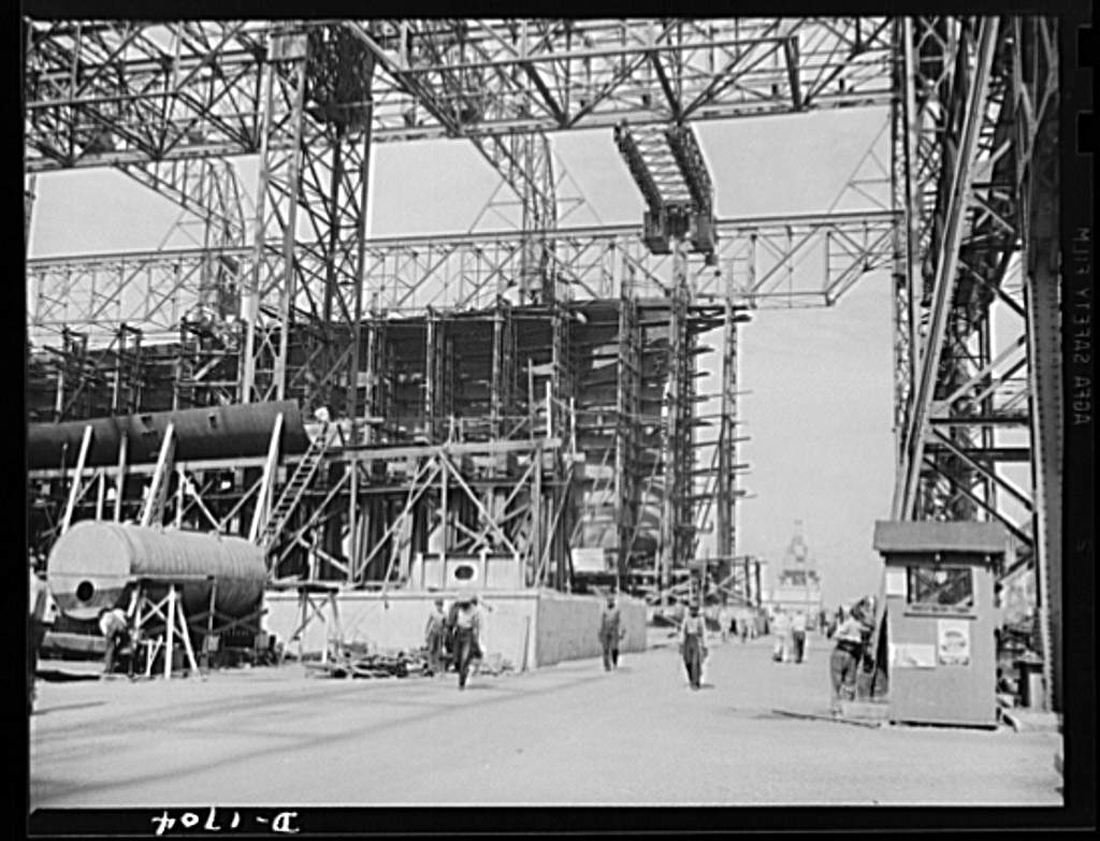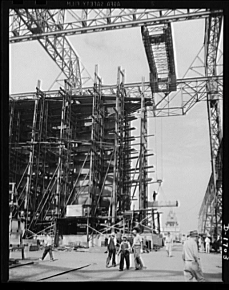 ![]() | 506k | Through the scaffolding may be seen the prow of the battleship Indiana (BB-58) under construction in October, 1940. The Norfolk-Newport News section of Virginia is contributing a large portion of the new tonnage of our rapidly expanding two-ocean Navy. | Photo # LC-USE6- D-001704, courtesy of the Library of Congress via Mike Green. | |