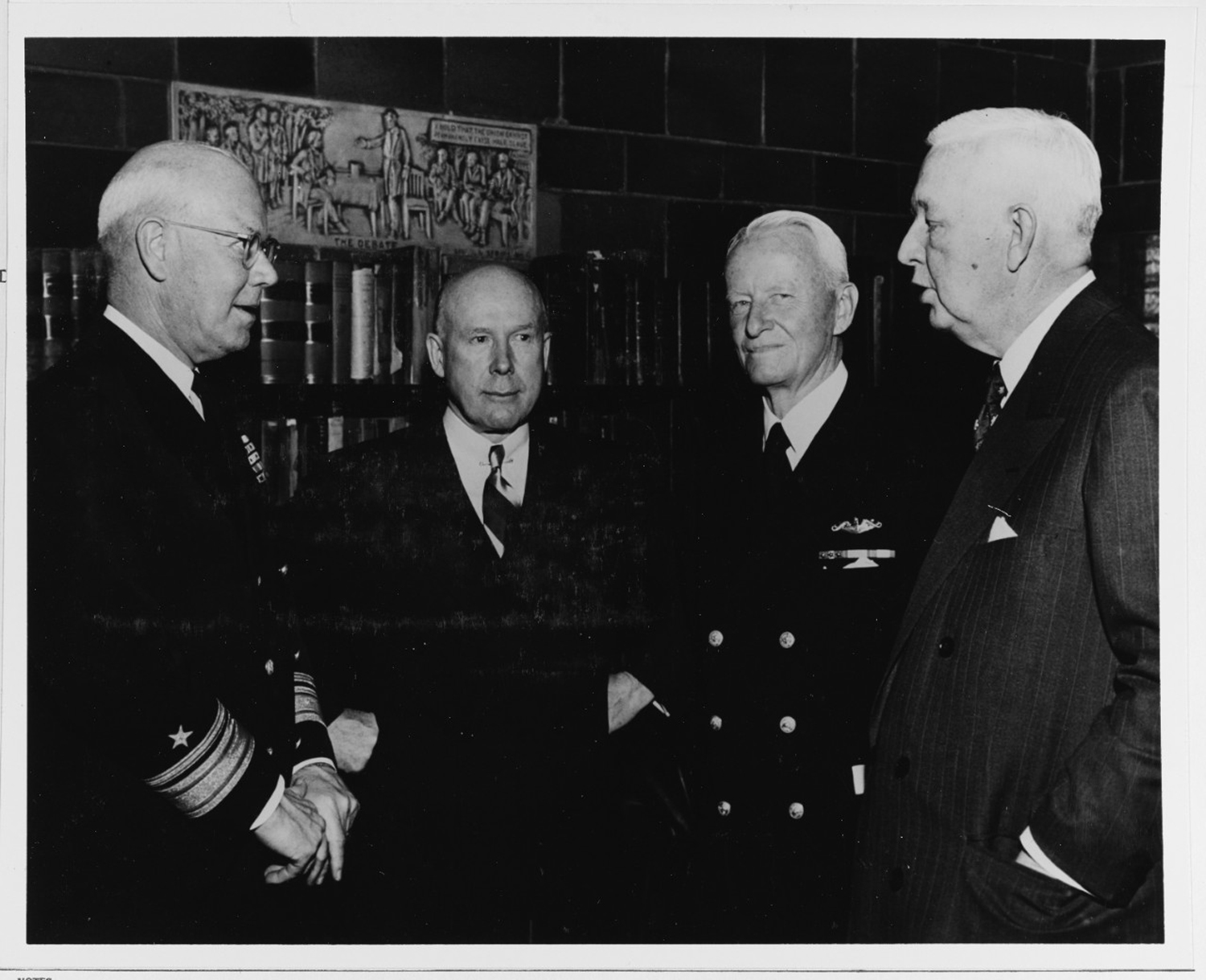 608k | Old Friends Get Together. L to R: Indiana's (BB-58) last WW II Captain, Rear Admiral F. P. Old, Secretary of Navy C.S. Thomas, Fleet Admiral Chester W. Nimitz, and an unidentified gentleman, Circa 1954-57. | USN photo courtesy of history.navy.mil | |
