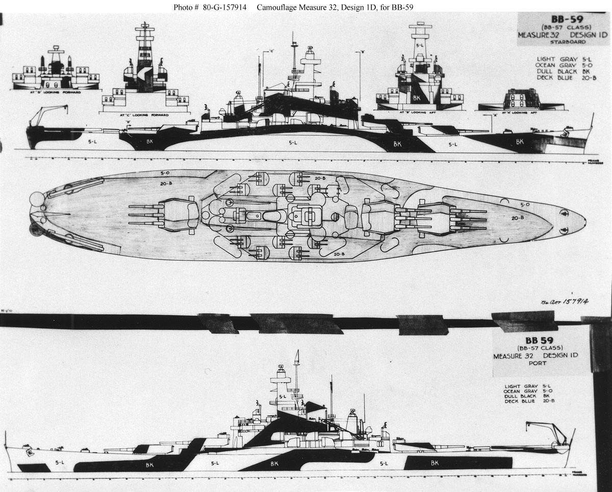 ![]() | 170k | Drawing prepared by the Bureau of Ships for Camouflage Measure 32, Design 1D intended for the battleship Massachusetts (BB-59), circa 1943. This camouflage design was not actually used on Massachusetts or any other ship of her class. | Official USN photo # 80-G-157914, from the Bureau of Ships Collection in the U.S. National Archives. | |