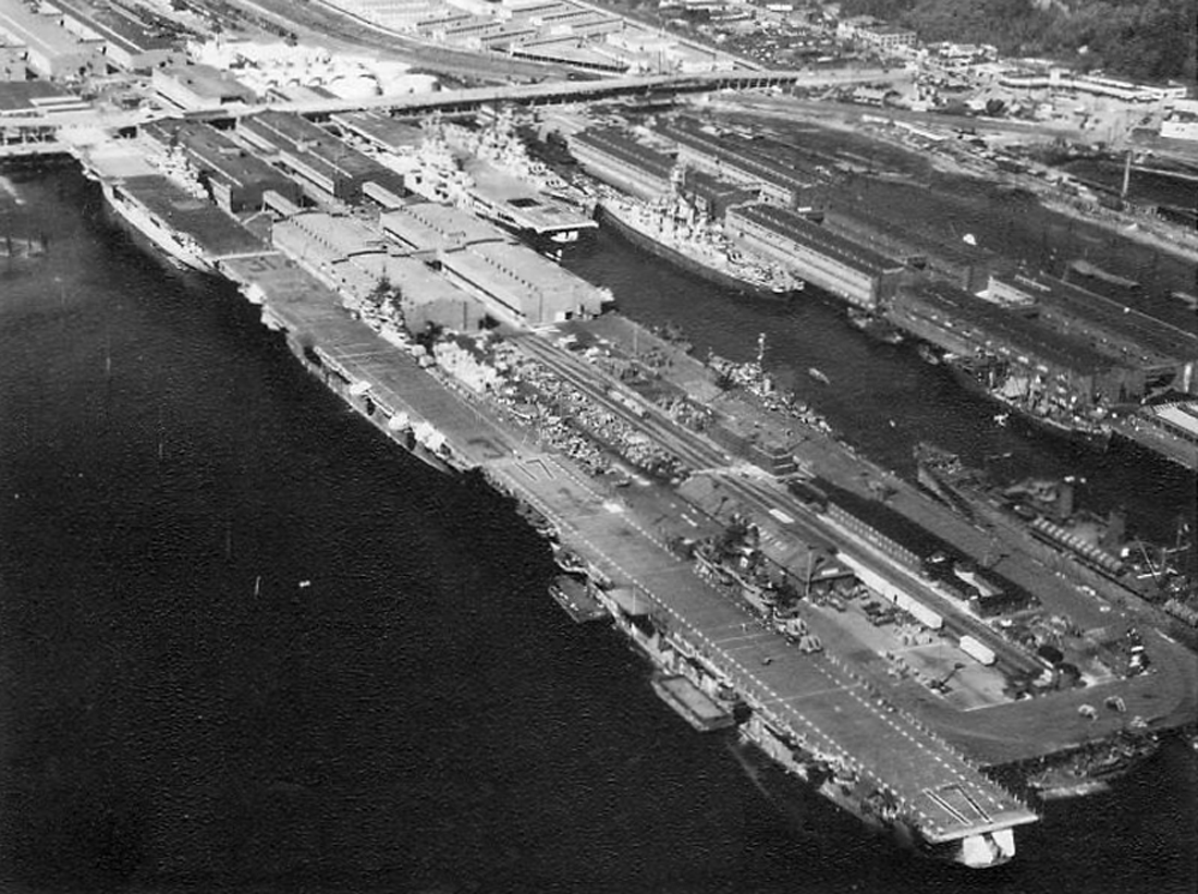 ![]() | 1.10k | Puget Sound NSY around 1948. There are five mothballed Essex class (CV-9) carriers at the left. To the right of the carriers are five battleships. I believe they are Alabama (BB-60), West Virginia (BB-48), Maryland (BB-46), Indiana (BB-58), Colorado (BB-45). | USN photo courtesy of Joe MacDonald. | |