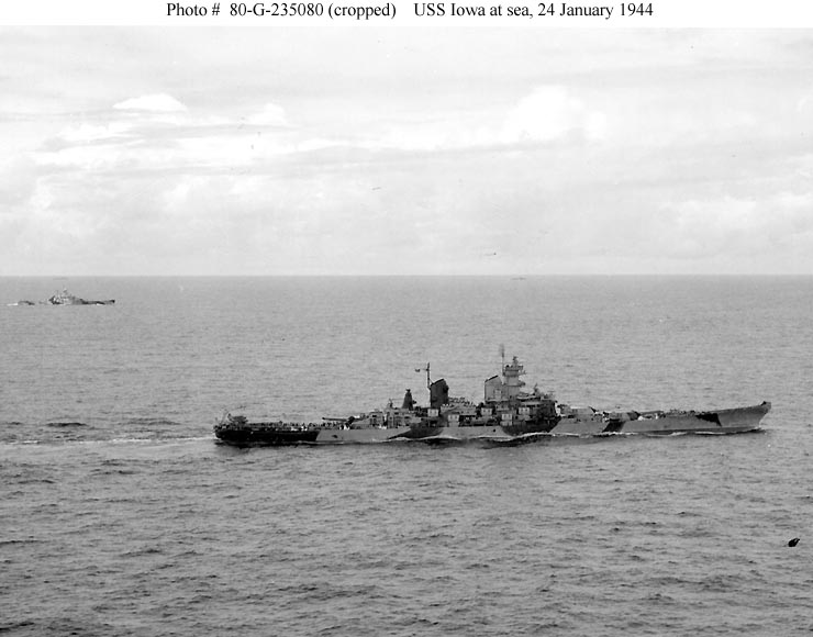 ![]() | 60k | Iowa (BB-61) underway at sea during the Marshalls Operation, 24 January 1944. She is wearing Camouflage Measure 32, Design 1B. In the left distance, also painted in Camouflage Measure 32 (possibly Design 11D), is Indiana (BB-58). This image has been cropped to emphasize the ships and their camouflage patterns. | Official USN photo # 80-G-235080, now in the collections of the National Archives. | |