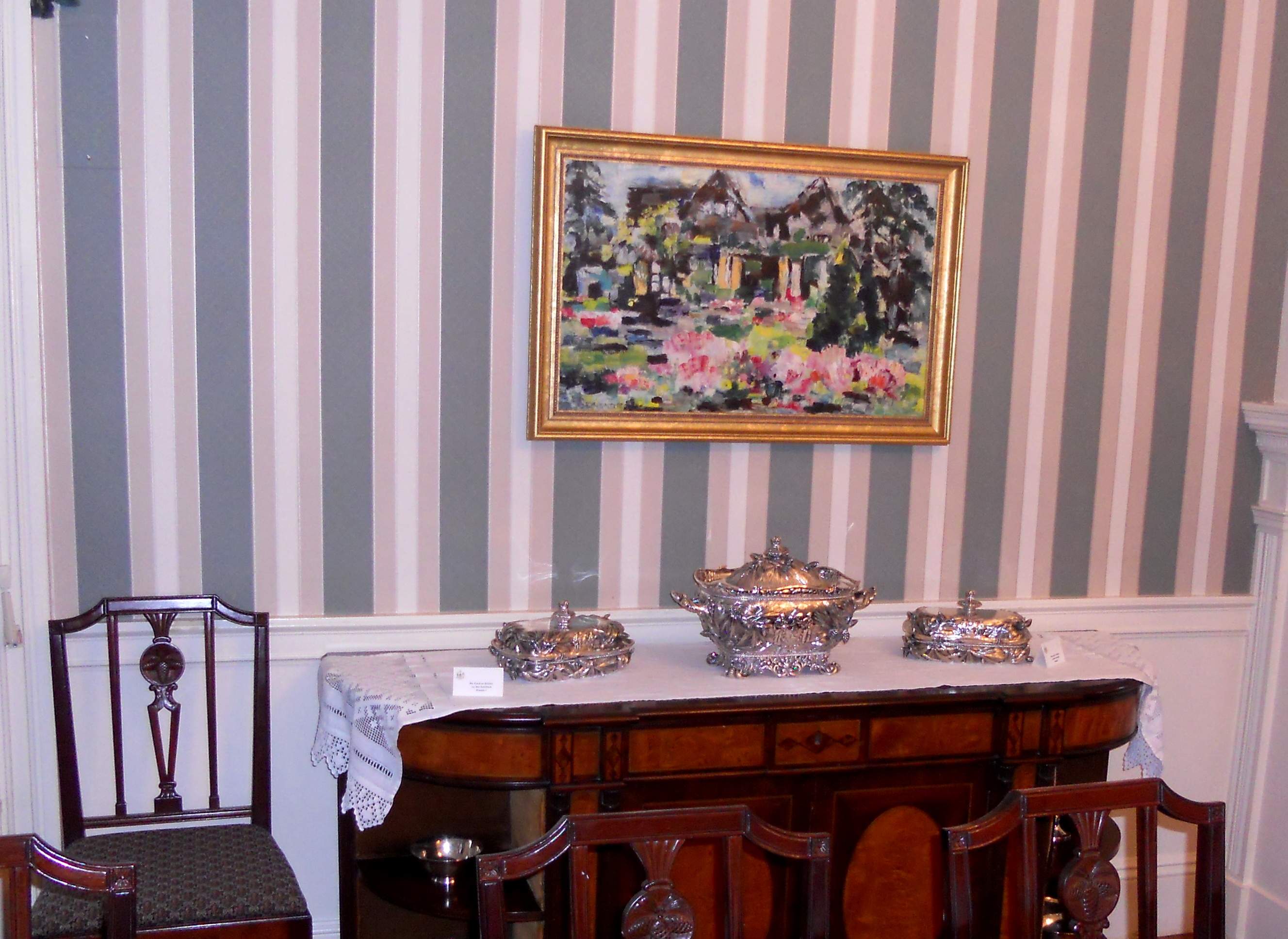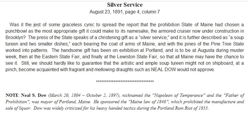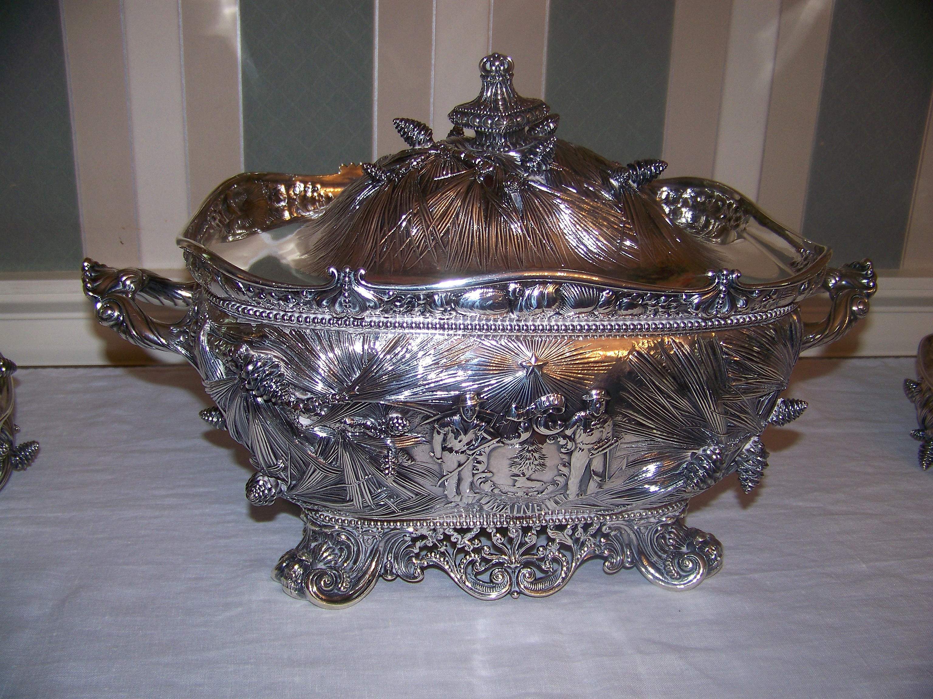 ![]() | 1.10k | Maine Soup Tureen & Silver set at Blaine House, Augusta, ME, 17 July 2012. | Silver Service clip from the N.Y. Times, 23 August 1891, page 4, column 7. Photos courtesy of Arnold Putnam. | |