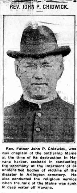 NR | REV. JOHN P. Chidwick Rev. Father John P. Chidwick, who was chaplain of the battleship Maine at the time of its destruction in Havana harbor, assisted in conducting the ceremony at the interment of 34 unidentified bodies of victims of the disaster in Arlington cemetery. He also conducted the religious service when the hulk of the Maine was sunk in deep water off Havana. |