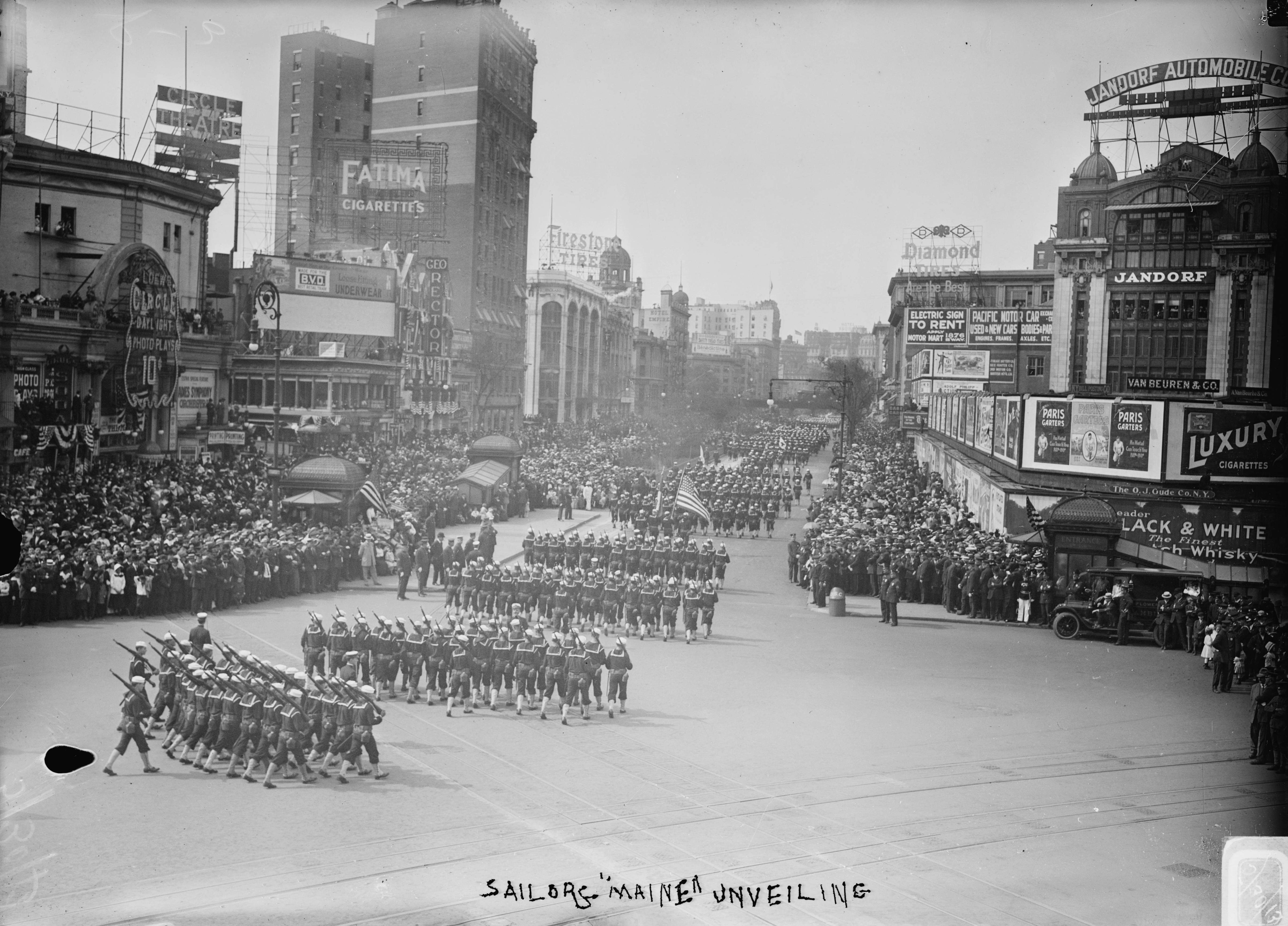 ![]() | 723k | Soldiers and sailors veterans of the present war honoring the dead who went down with the Maine at the services held today at the Maine Monument in Columbus Circle, 30 May 1919. | Photographer: Underwood & Underwood. National Archives Identifier: 26423729 Local Identifier 165-WW-95A-029. Photo courtesy of catalog.archives.gov | |