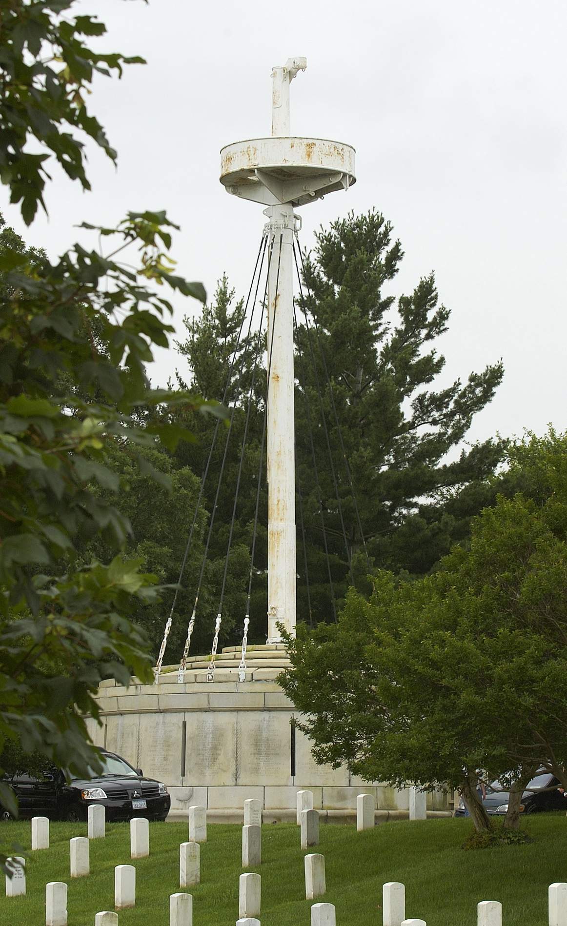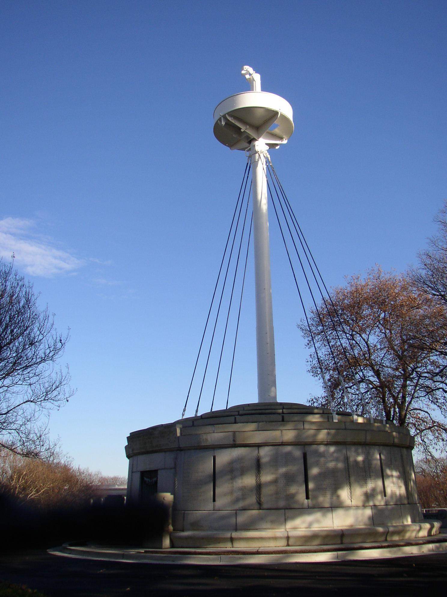 ![]() | 262k | Summer view of the Maine Mast Monument, at Arlington, Va. 17 June 2003, bounded on two sides by Sigsbee Drive, is named after Adm. Charles Dwight Sigsbee, who commanded the vessel as a captain at the time of its destruction. The mast is the actual main mast from the Maine, which was sunk in Havana Harbor, Cuba, 15 February 1898. The mizzenmast is at the U.S. Naval Academy in Annapolis, Md. The base of the monument represents the turret of a battleship; through its center is the main mast from the Maine. Around the sides of the turret are inscribed the names of all who lost their lives in the disaster, and over the door is the inscription: "Erected in memory of the officers and men who lost their lives in the destruction of the Maine at Havana, Cuba, February Fifteenth MDCCCXCVIII." On the south side are two bronze cannons that were captured from the Spanish. Fall view. | USN photo # N-9593R-031 by Chief Warrant Officer Seth Rossman, courtesy of news.navy.mil / Navy News Stand & Mike Green. | |