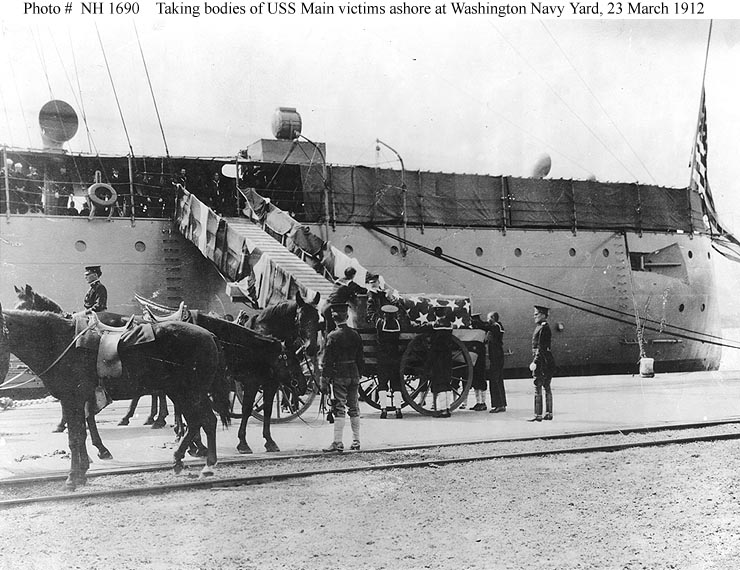 ![]() | 109k | Repatriation of Maine victims, 1912. The flag-draped caskets of the victims of the Maine explosion are brought ashore at the Washington Navy Yard, District of Columbia, from Birmingham (C-2), 23 March 1912. | U.S. Naval Historical Center Photograph # NH 1690. | |