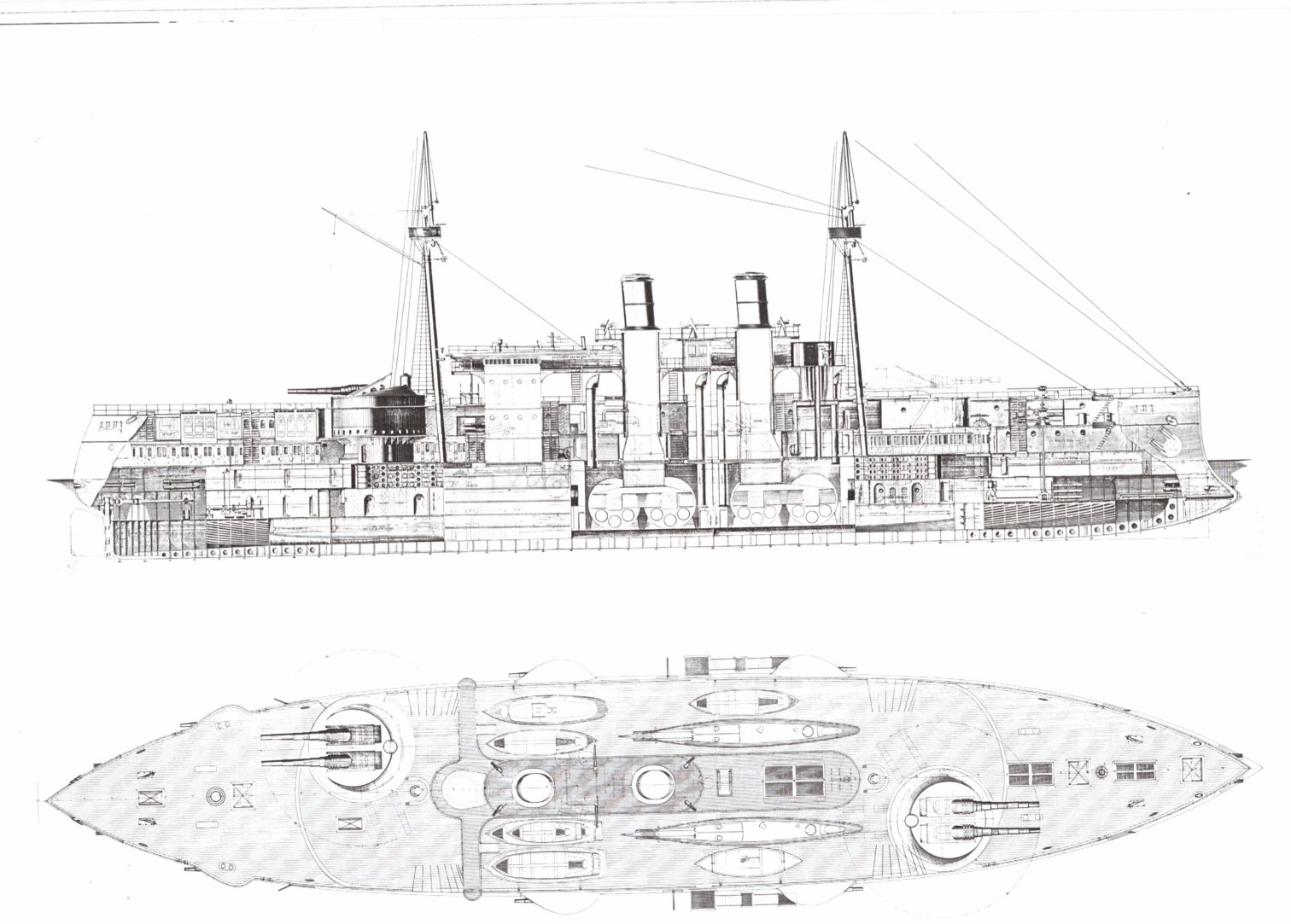 ![]() | 208k | Construction & Repair proposal that became the Maine. Note the 10-inch guns are in open shields. The ship was actually built with enclosed turrets, which had to be mounted a deck height lower because of their weight. The shields and barbettes were initially attractive because they were light enough to be mounted very high in a ship, but they grew less and less attractive as rapidly firing guns came to threaten their crews. The heavier guns fired slowly enough that they had to concentrate on easier targets such as belt armor. | Photo and text courtesy of U.S. Battleships: An Illustrated Design History by Norman Friedman. | |