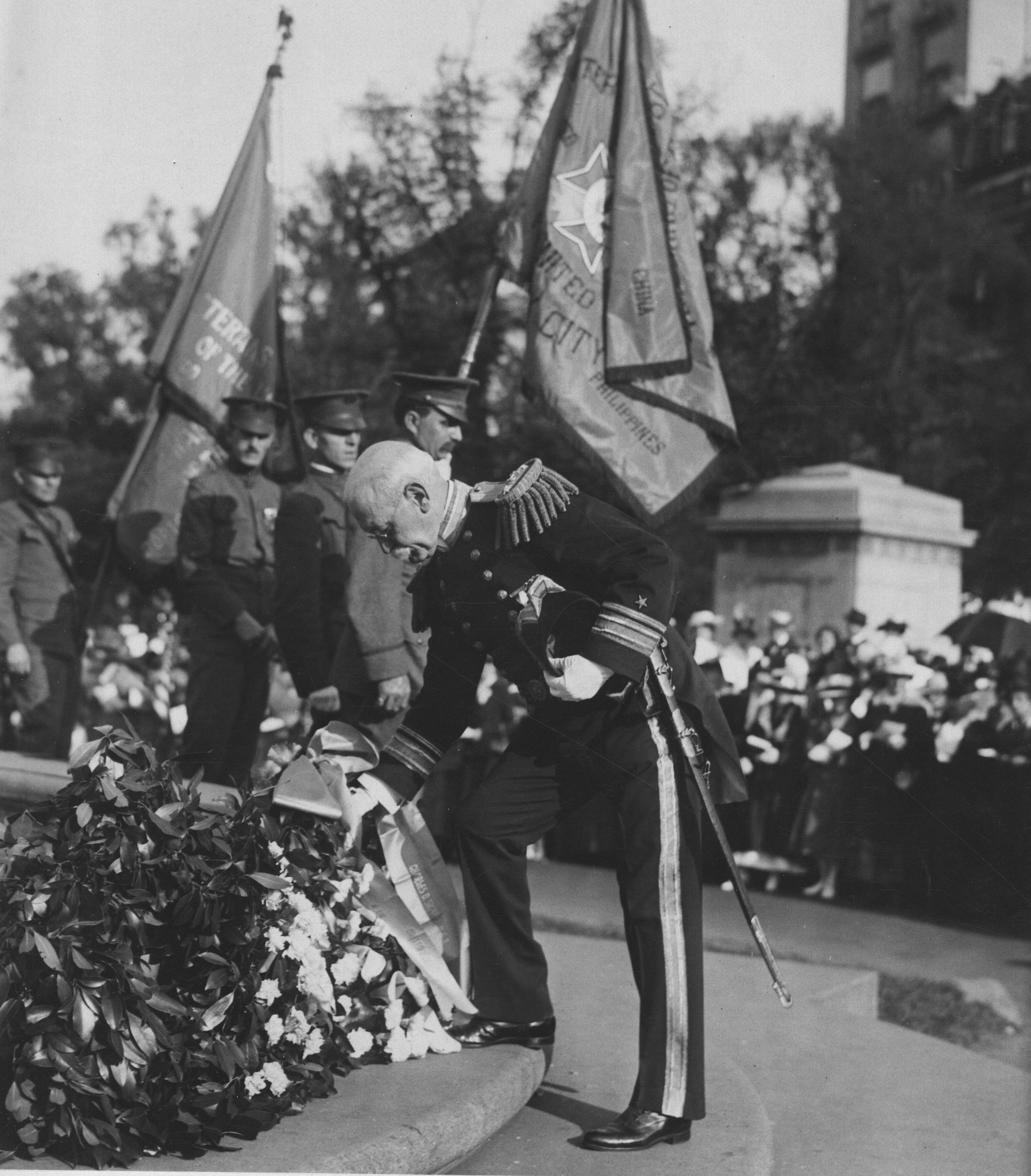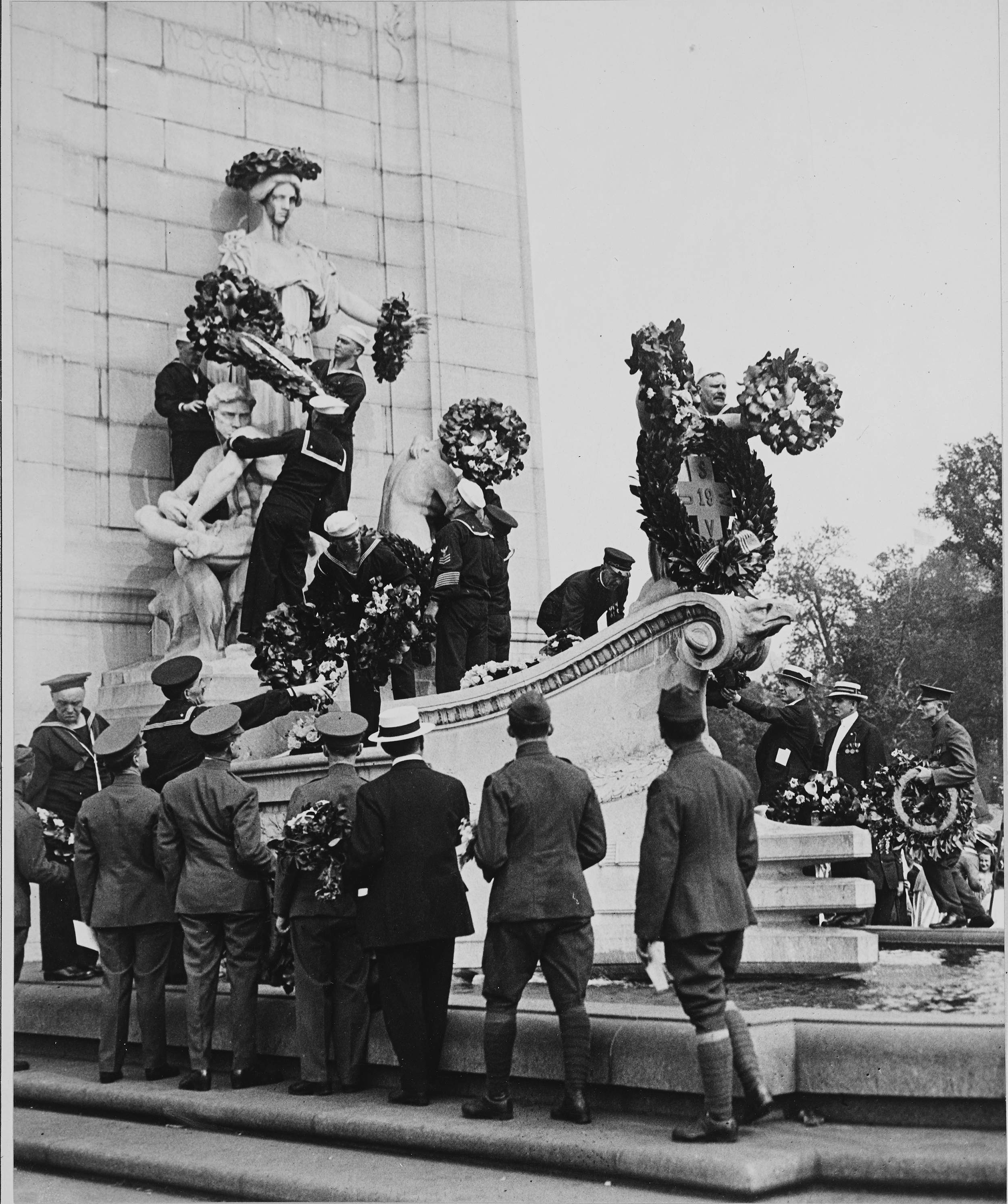 ![]() | 699k | At Columbus Circle, New York, N.Y., 1917, Memorial Day exercises were held by the veterans of Foreign wars of the U.S. More than a hundred floral pieces were placed on the Maine Memorial monument. Rear Admiral Charles D. Sigsbee, who was in command of the Maine when the battleship was blown up placed two wreaths. More than 7,000 people gathered about the monument. Photo shows Rear Admiral Charles D. Sigsbee placing a wreath on the Maine Monument. | Photographer: International Film Service. National Archives Identifier: 20809792 Photo courtesy of catalog.archives.gov |