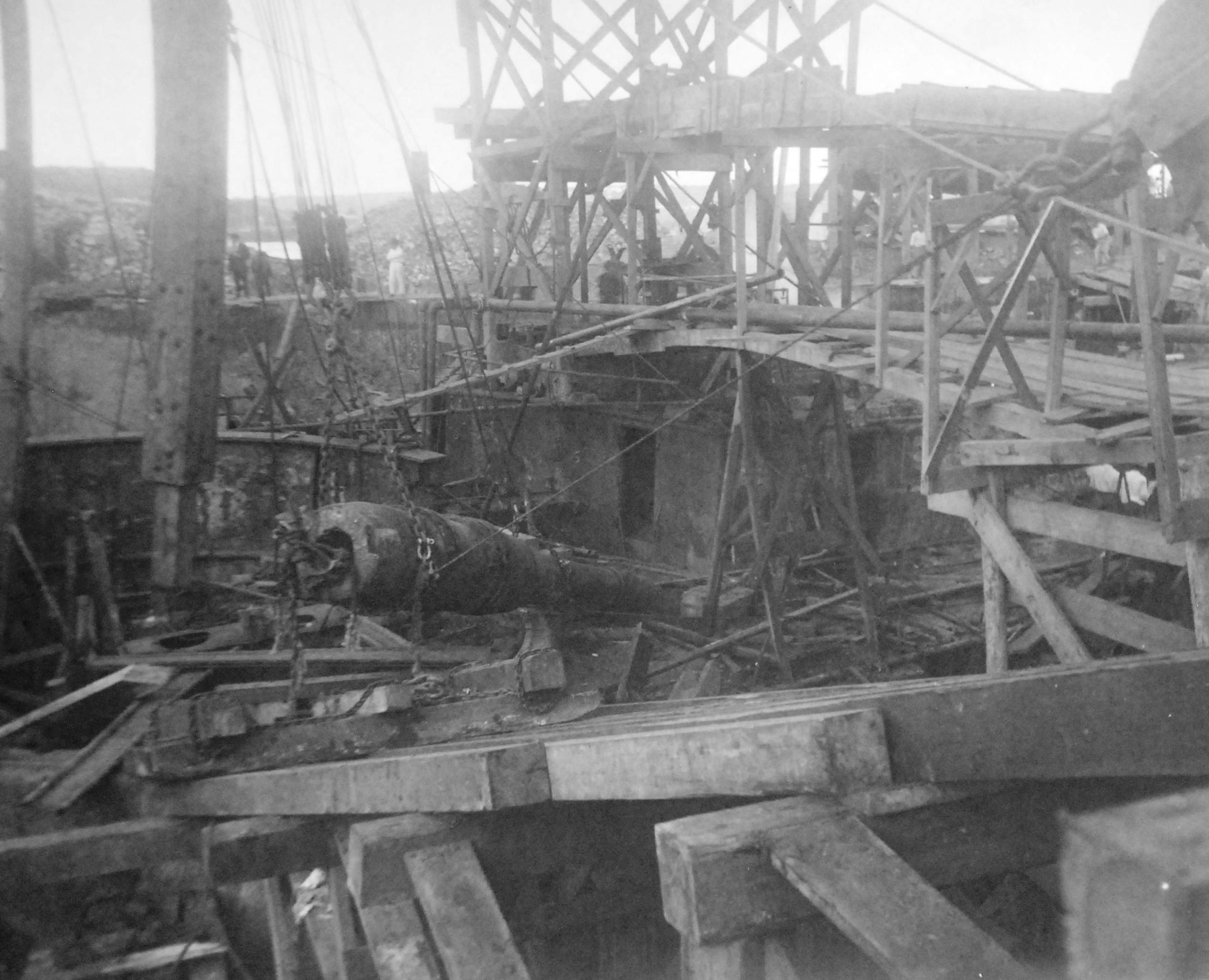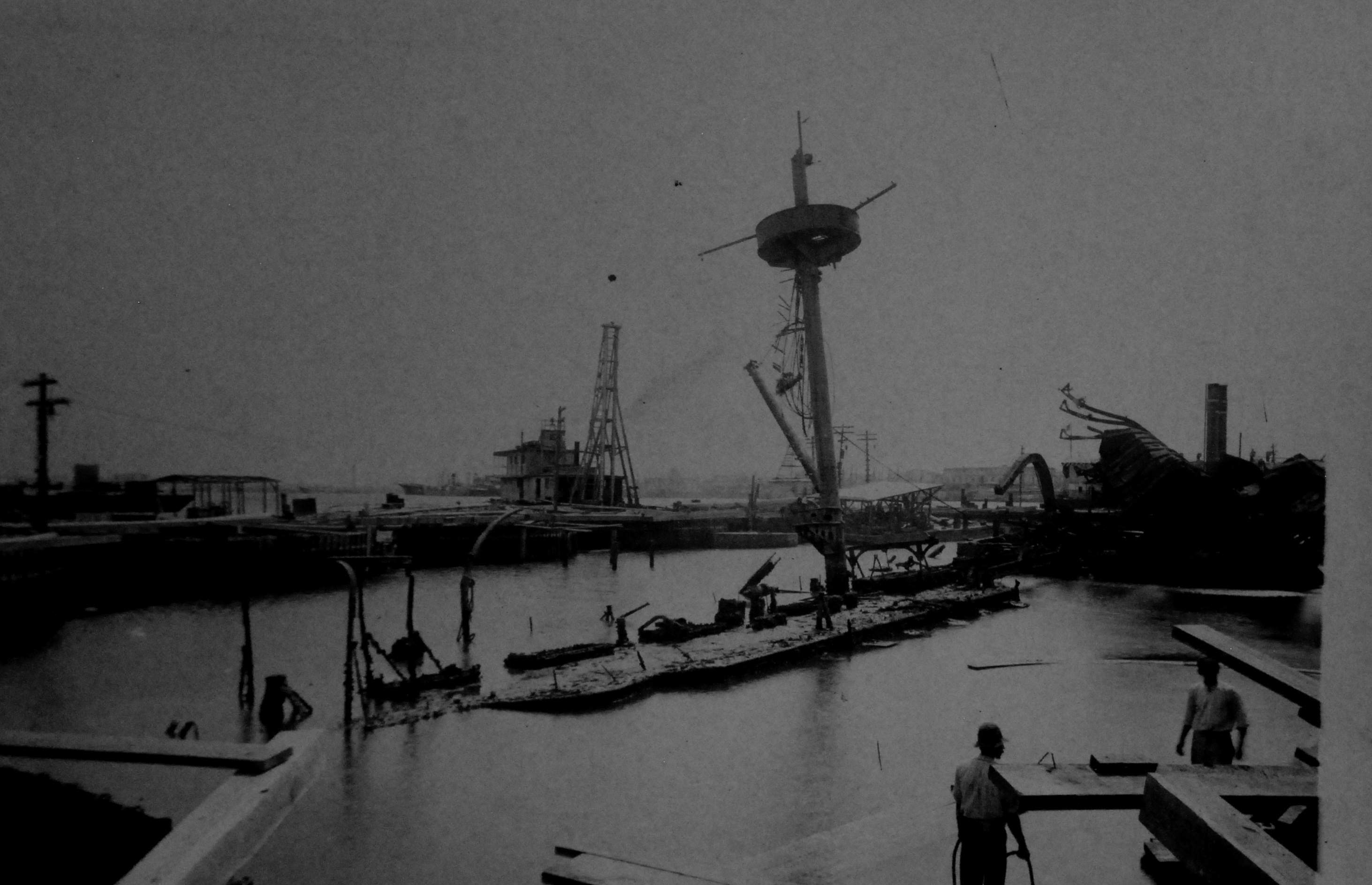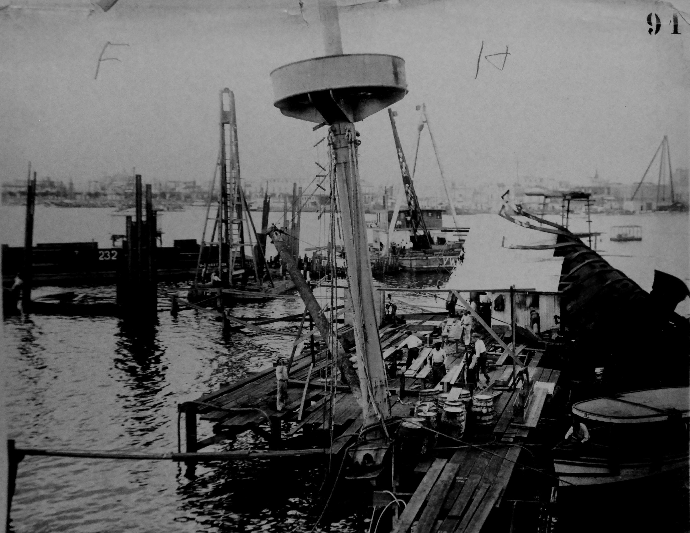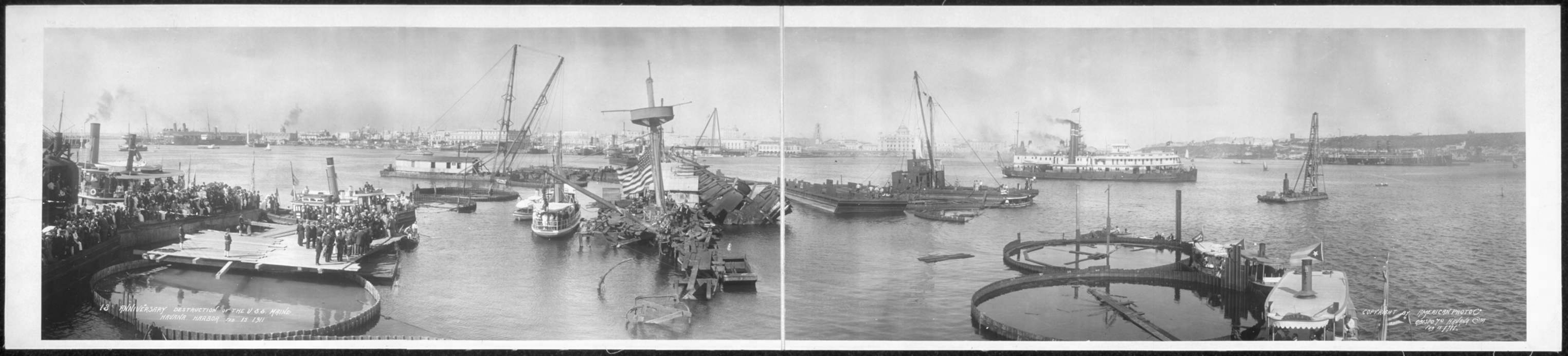 ![]() | 362k | Maine wreck moored outside of cofferdam. The tugs alongside are all civilian contractors. | Photo i.d. via David Wright. USN photo # Lot 8936-56, from the National Museum of the U.S. Navy, courtesy of flickr.com. | |