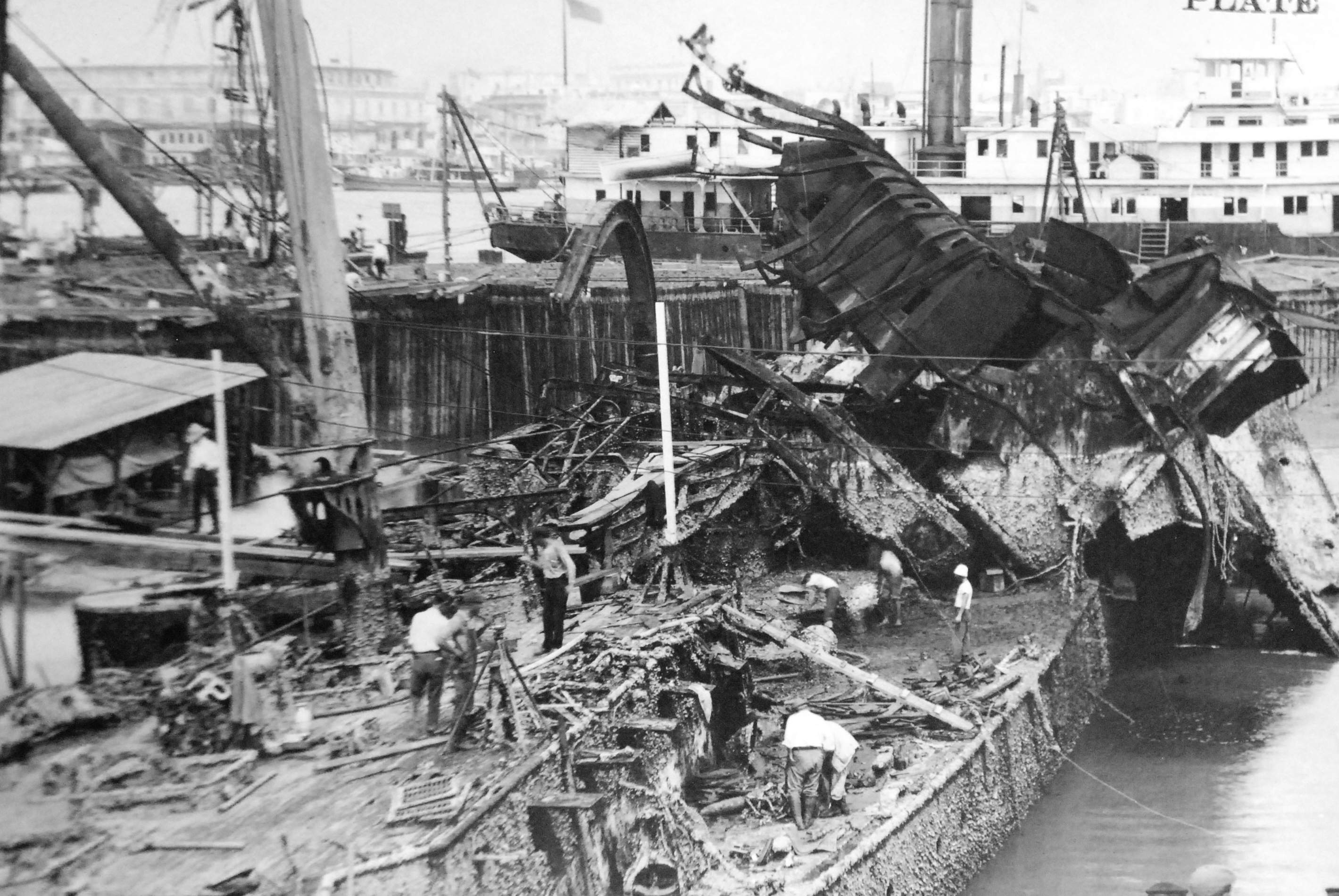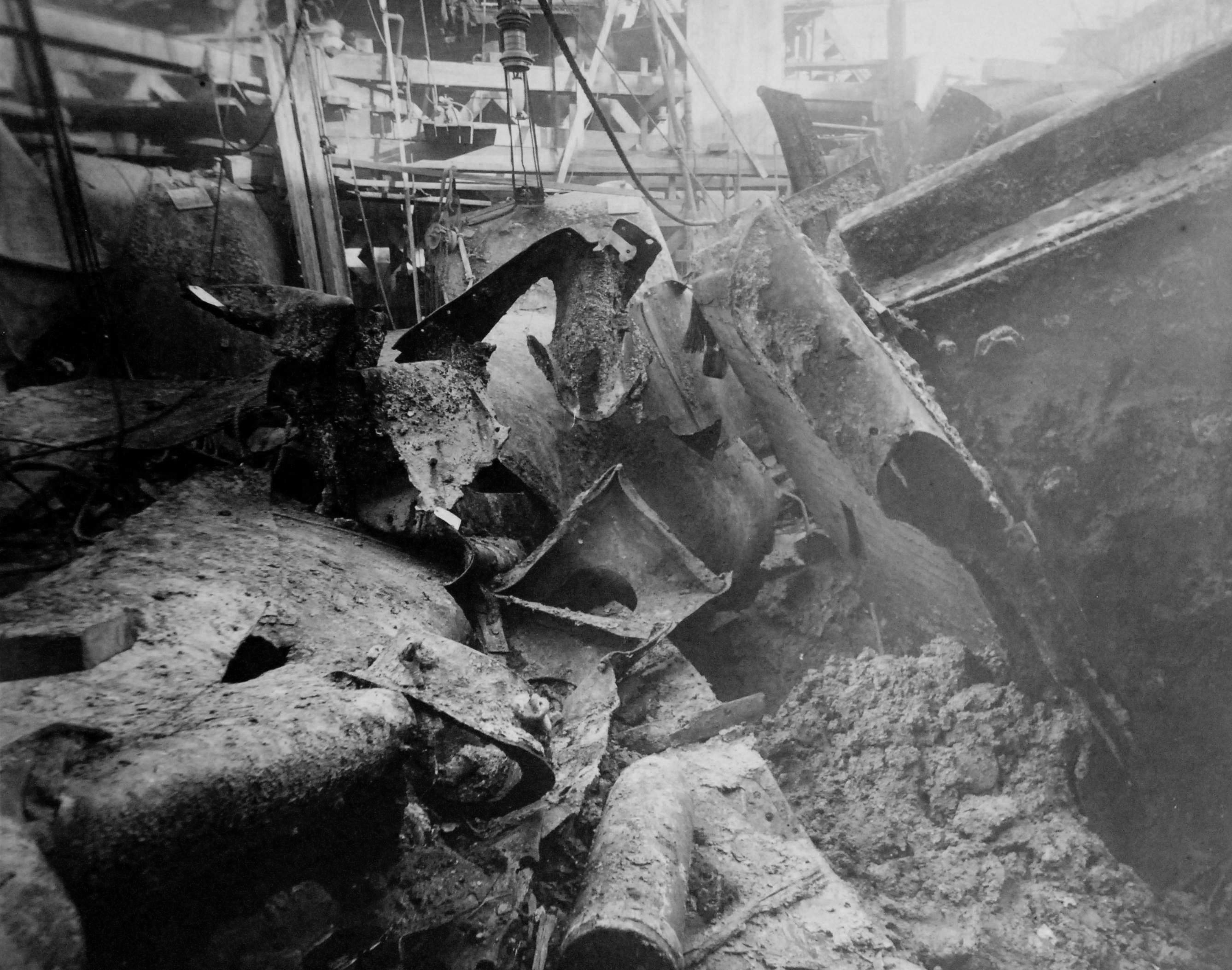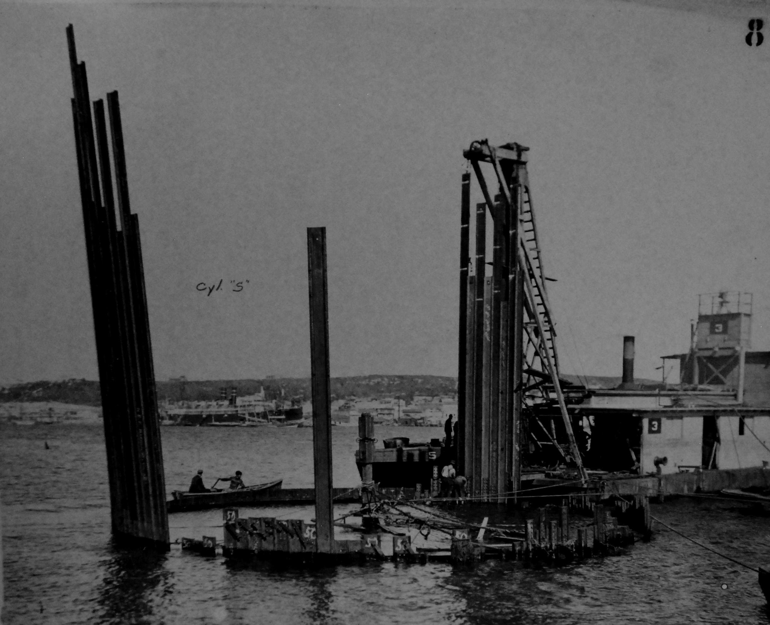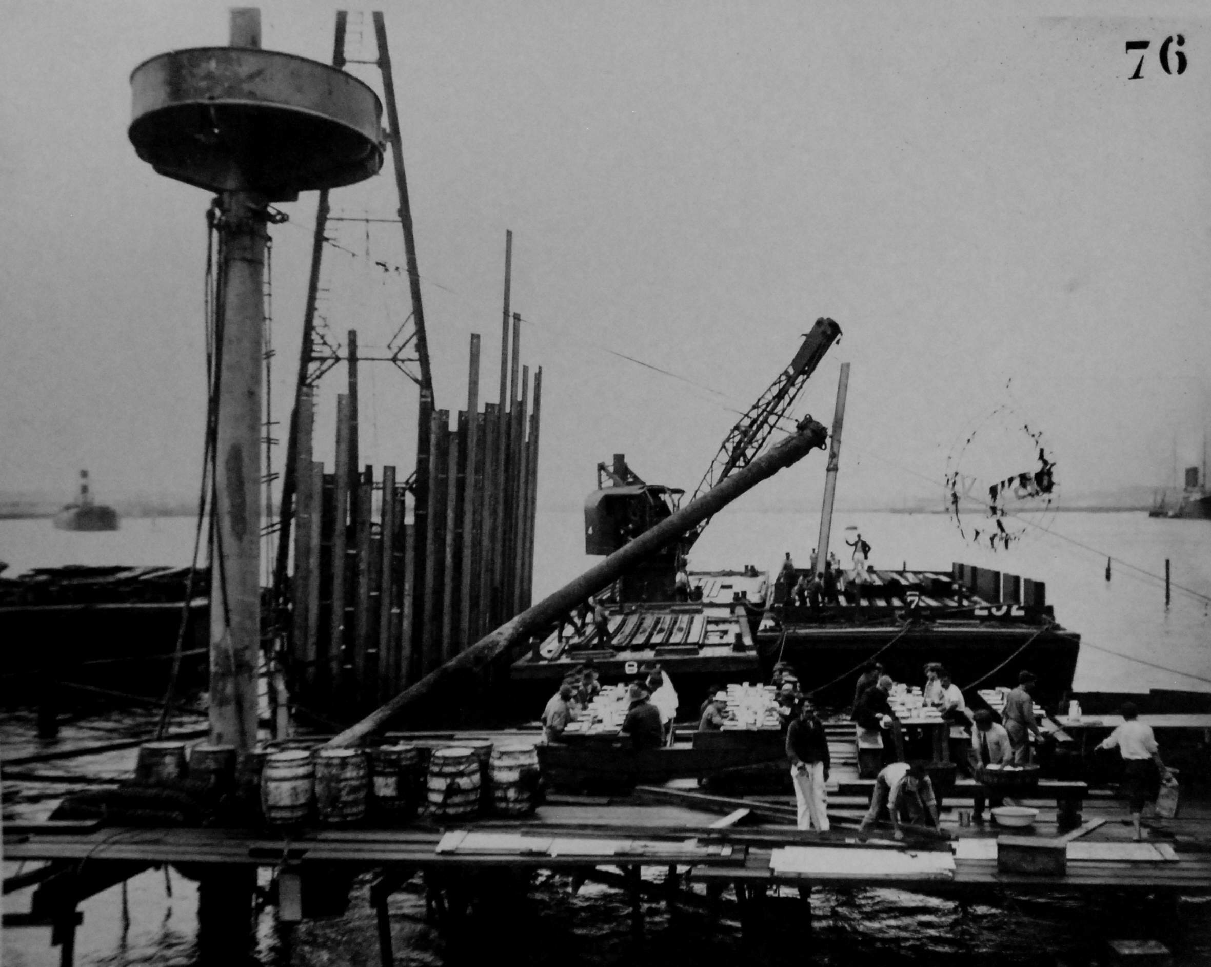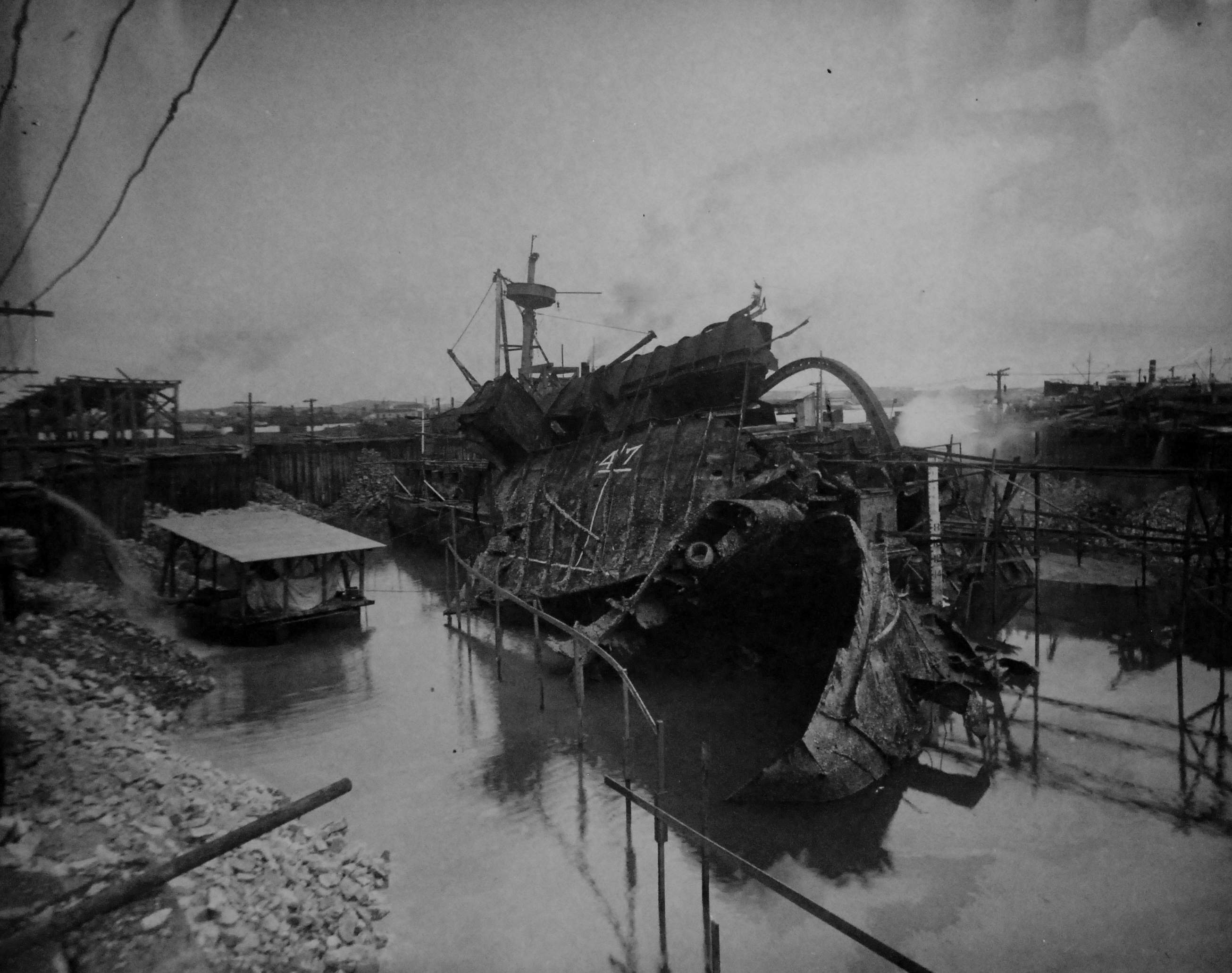![]() | 362k | Maine wreck moored outside of cofferdam. The tugs alongside are all civilian contractors. | Photo i.d. via David Wright. USN photo # Lot 8936-56, from the National Museum of the U.S. Navy, courtesy of flickr.com. | |