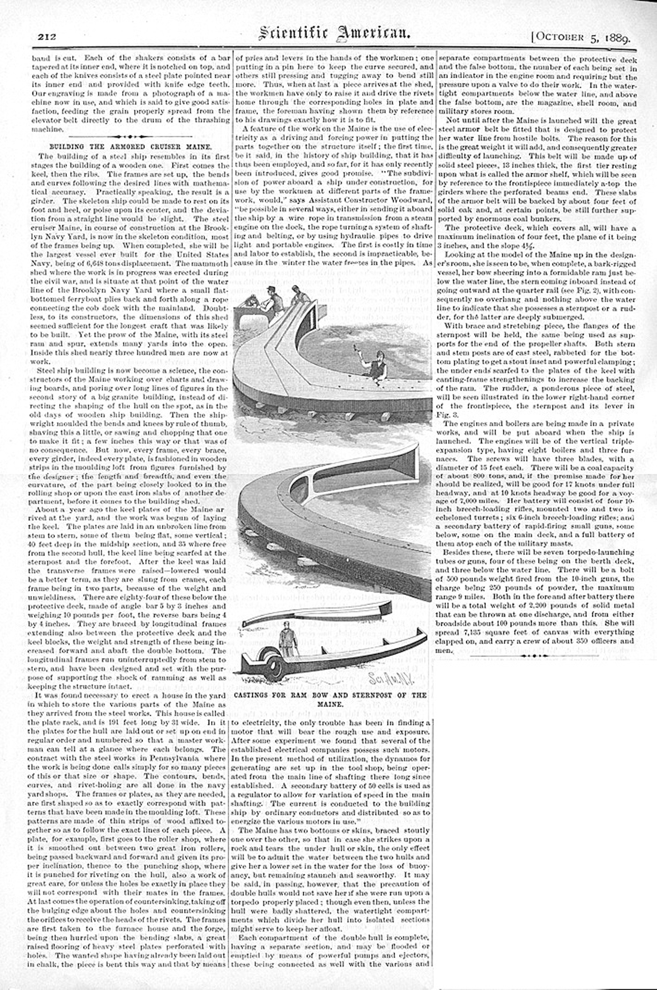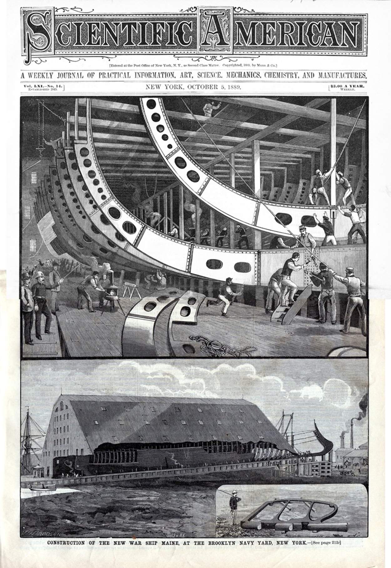![]() | 337k | Photo of the construction of the New Warship Maine at the Brooklyn Navy Yard, cover of Scientific American on 5 October 1889 and page 2. | Photo courtesy of Arnold Putnam. | |