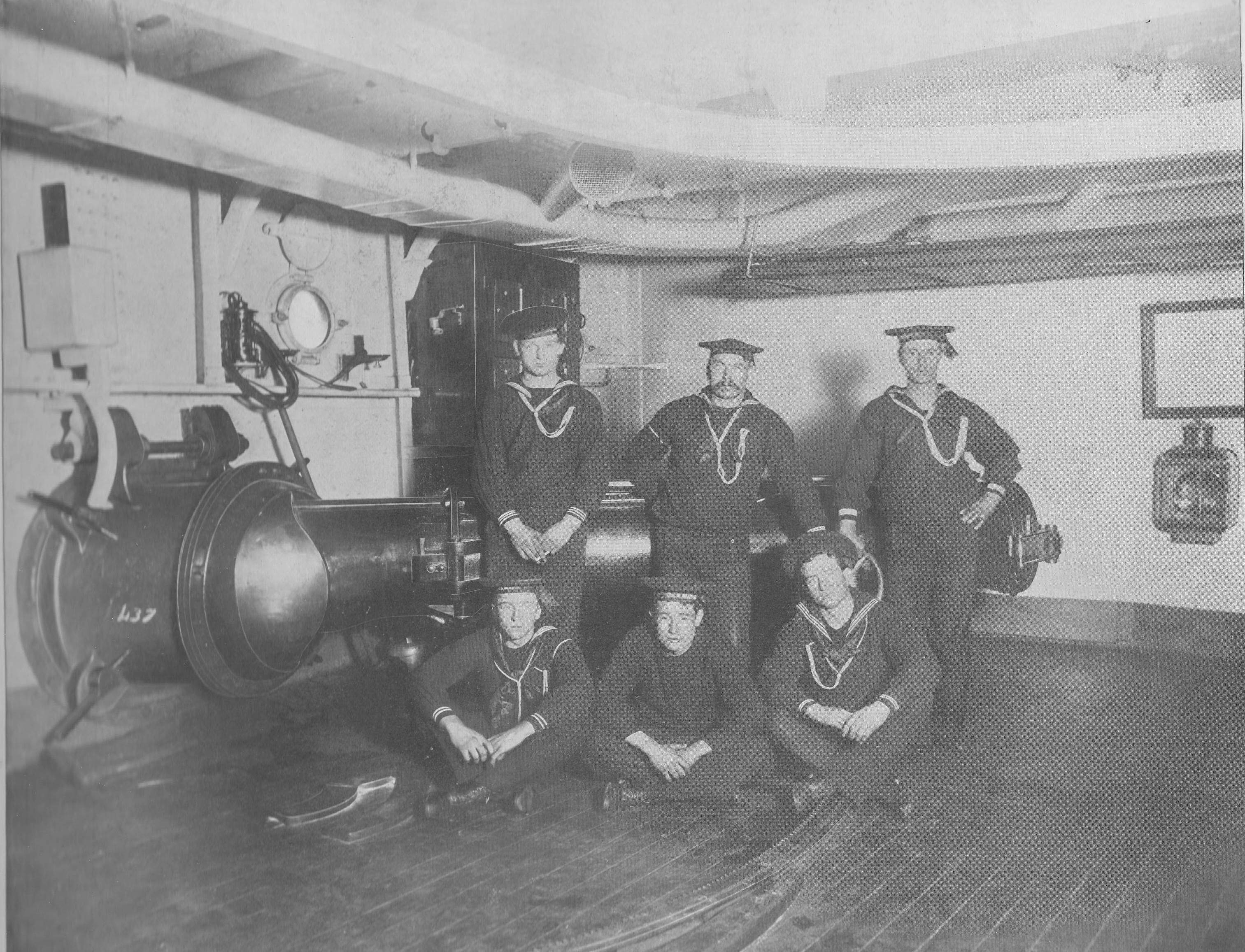 ![]() | 127k | "Gunner's Gang", photographed in one of the ship's torpedo rooms. Half toned photograph, published in Uncle Sam's Navy, 1898. | U.S. Naval Historical Center Photograph # NH 50183. | |