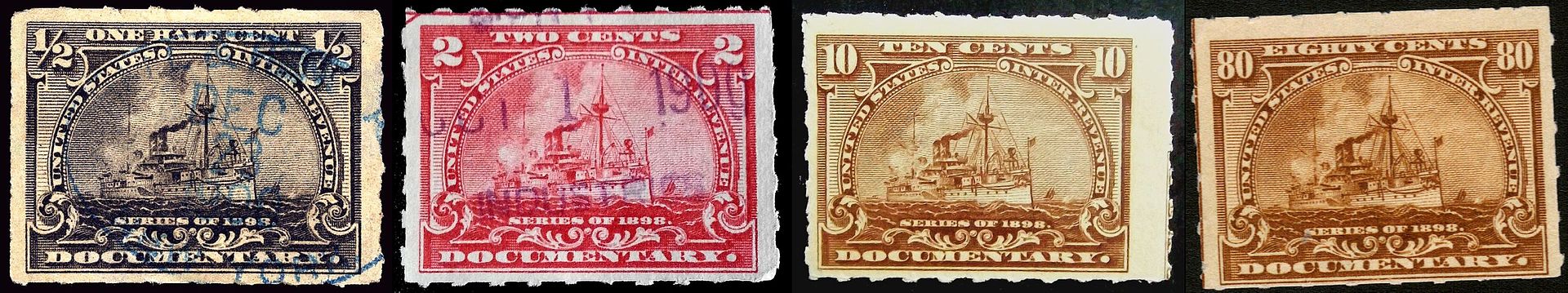 ![]() | 273k | Issues of 1898 In the continuation of providing funding for the Spanish–American War Congress authorized a tax on a wide range of goods and services including various alcohol and tobacco products, tea and other amusements and also on various legal and business transactions (such as Stock certificates, bills of lading, manifests, and marine insurance). To pay these tax duties revenue tax stamps were purchased and affixed to the taxable item or respective certificate. There are seventeen stamps in this issue which occur in denominations ranging from ½-cent to 50-dollars which were printed on double lined watermarked paper. Two types of perforations were used: Rouletted perforations and 'hyphen' shaped perforations. Numerous double transfers occur (doubled image) in this issue. 4 stamps of the Maine appear here. | Text & photos courtesy of wikipedia.org courtesy of Tommy Trampp. | |