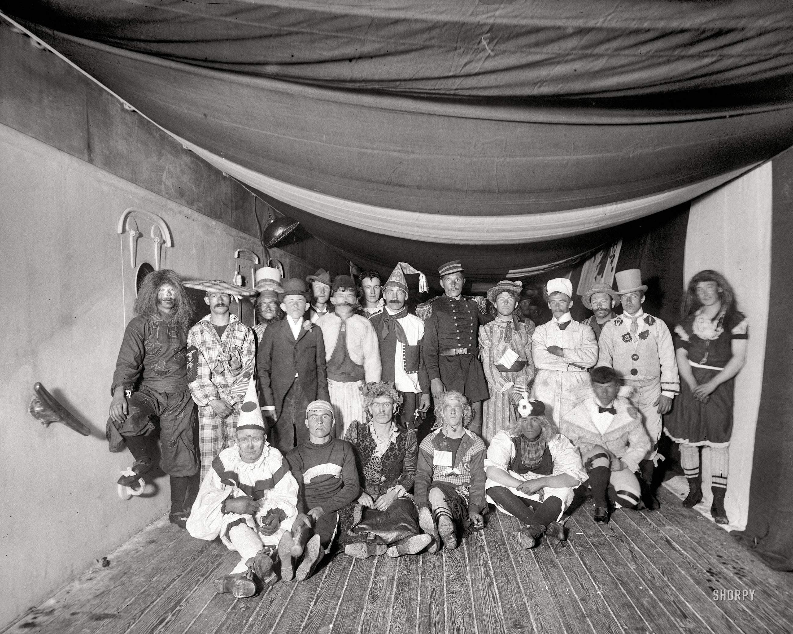 ![]() | 829k | Aboard the Maine in 1896. "Three views of a fancy dress ball." Our second look at these seafaring thespians aboard the ill-fated battleship. | 8x10 inch dry plate glass negative by Edward Hart, Detroit Publishing Company, # 4a14376a & 4a14377a courtesy of shorpy.com. | |