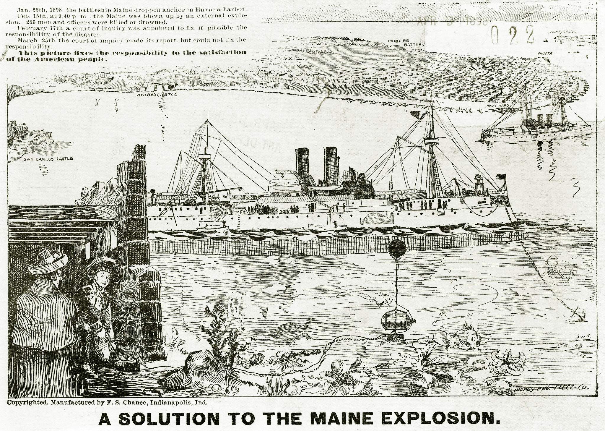 ![]() | NR | GOING TO HER DOOM. The American battleship Maine passing Morro Castle on the way to her anchorage in Havana harbor, at the point where her wreck now lies, and where so many of Uncle Sam's brave boys in blue sleep beneath the murky waters. OFFICERS OF THE MAINE EXPECTED THEIR SHIP WOULD BE DESTROYED One of Them Said to Have Written That the Worst Would Happen if the Vessel Remained in the Harbor of Havana After the 15th of February, the Fatal Day. | Image and text provided by University of California, Riverside. Photo & text by The San Francisco Call.(San Francisco [Calif.] 1895-1913, 22 February 1898, Image 1, via chroniclingamerica.loc.gov. | |