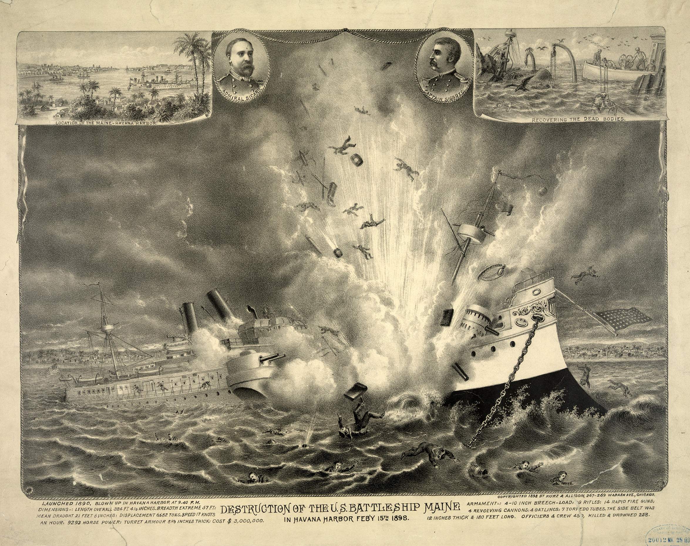 ![]() | 888k | Painting by the The Chicago firm of Kurz & Allison showing the destruction of the U.S. battleship Maine in Havana Harbor, with inserts of location of the "Maine-Havana Habor," recovering the dead bodies, and head-and-shoulders portraits of Admiral Sicard and Captain Sigsbee. | Digital ID: # 3j00059v, LC-USZC4-1572. Source: Library of Congress Prints and Photographs Division, from the George Grantham Bain Collection. | |