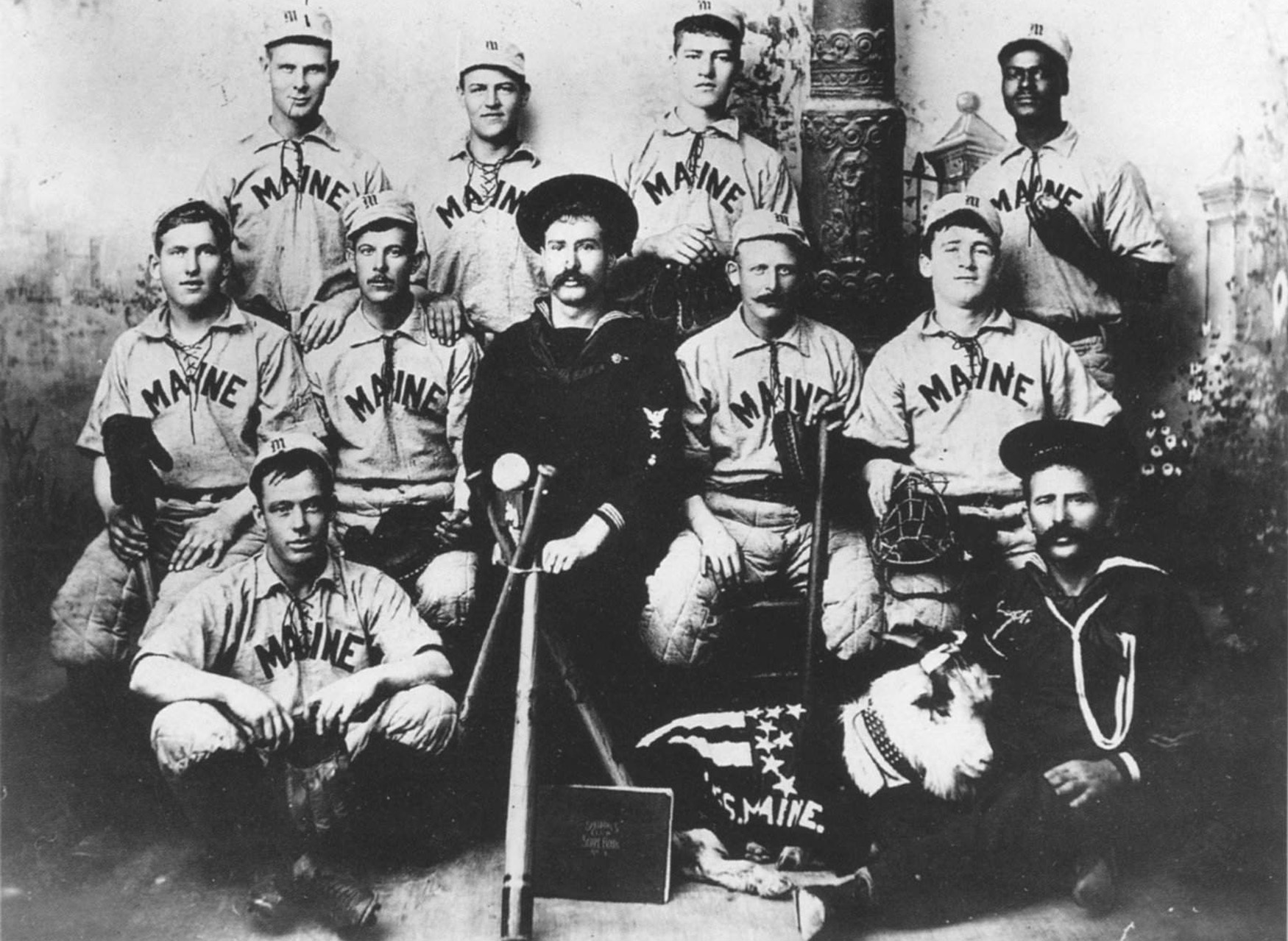 ![]() | 449k | Maine baseball team, 1897. All blown up at Havana except J.H. Bloomer (back row, left corner) when the Maine was sunk by a mysterious explosion on 15 February 1898 in Havana harbor. | Source: Library of Congress Prints and Photographs Division. Photo courtesy of SK/3 Tommy Trampp via Gary Priolo. | |