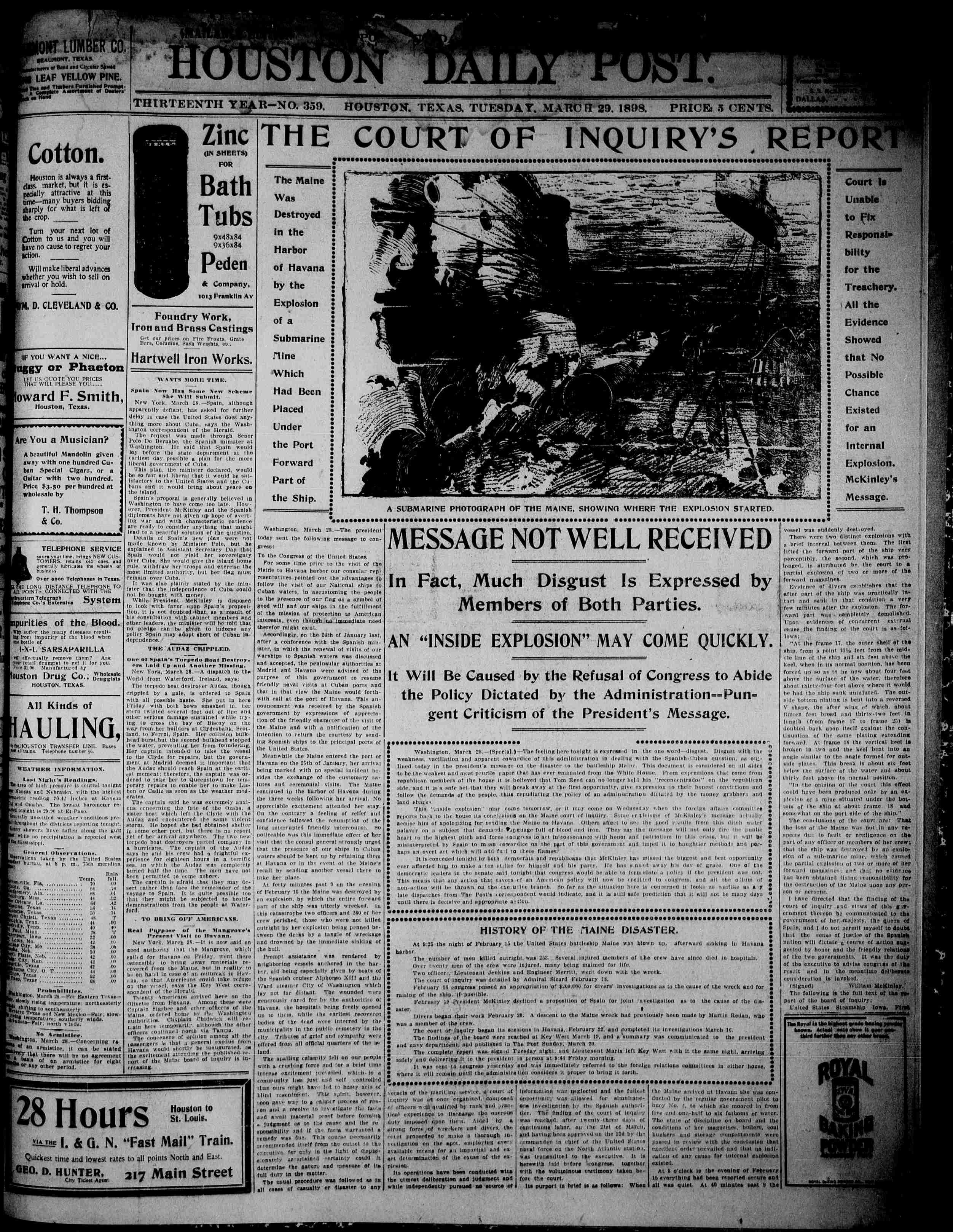 ![]() | 469k | THE BATTLESHIP MAINE AS SHE APPEARED AT SEA UNDER FULL STEAM. THE MAINE CATASTROPHE - ACCIDENT OR DESIGN | Image and text provided by University of Utah, Marriott Library. Photo from The Salt Lake Herald. (Salt Lake City [Utah) 1870-1909, 17 February 1898, Image 1, via chroniclingamerica.loc.gov. | |