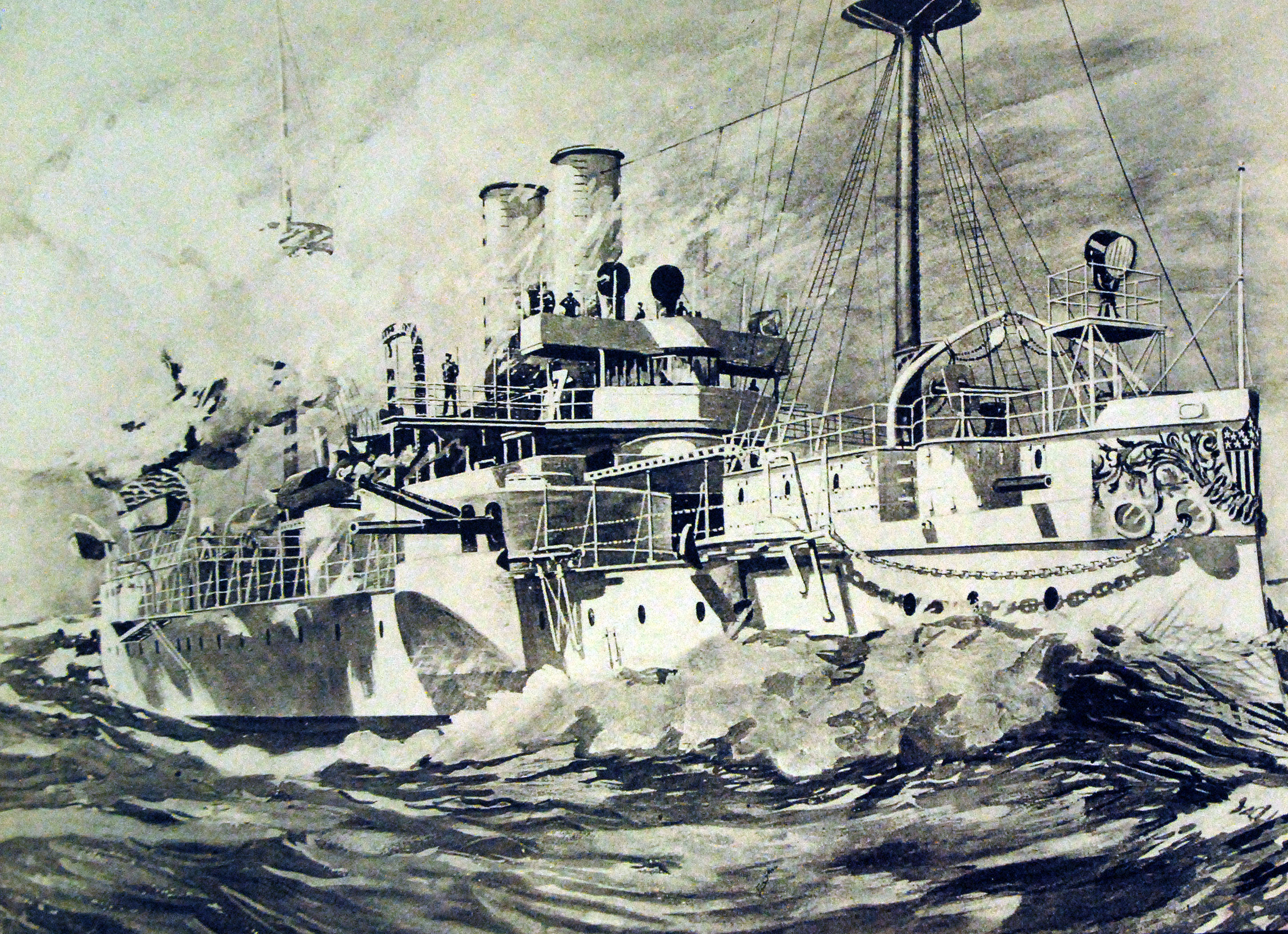 1.39k | NORTH ATLANTIC SQUADRON IN ACTION FIRING OFF $1,000,000 WORTH OF POWDER AND SHELL IN AN HOUR. Iowa (BB-4), Ericsson (TB-2), Porter (TB-6), Indiana (BB-1), Texas, Maine, New York (ACR-2), Amphitrite (BM-2), Terror (M-4), Raleigh (C-8). Drawn by an expert marine artist from exact details. The line of battle is that described by Captain Mahan. | Image and text provided by Montana Historical Society; Helena, MT. Photo from The Anaconda Standard. (Anaconda, Mont.) 1889-1970, 16 May 1897, Image 16, via chroniclingamerica.loc.gov. | |