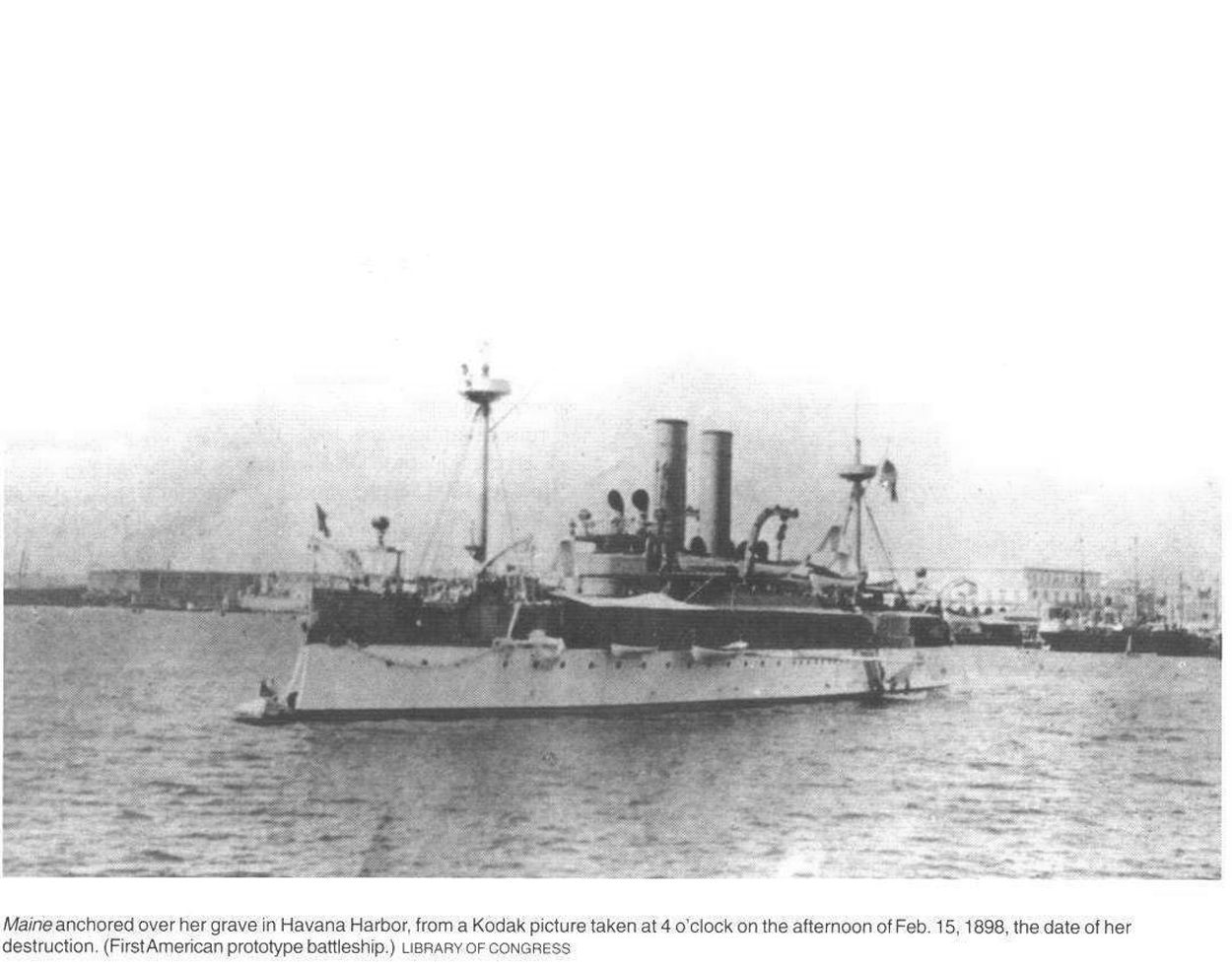 ![]() | 426k | Maine anchored over her grave in Havana Harbor, from a Kodak picture taken at 4 o'clock on the afternoon of 15 February 1898, the date of her destruction. | USN photo courtesy of Scott Koen & ussnewyork.com. | |