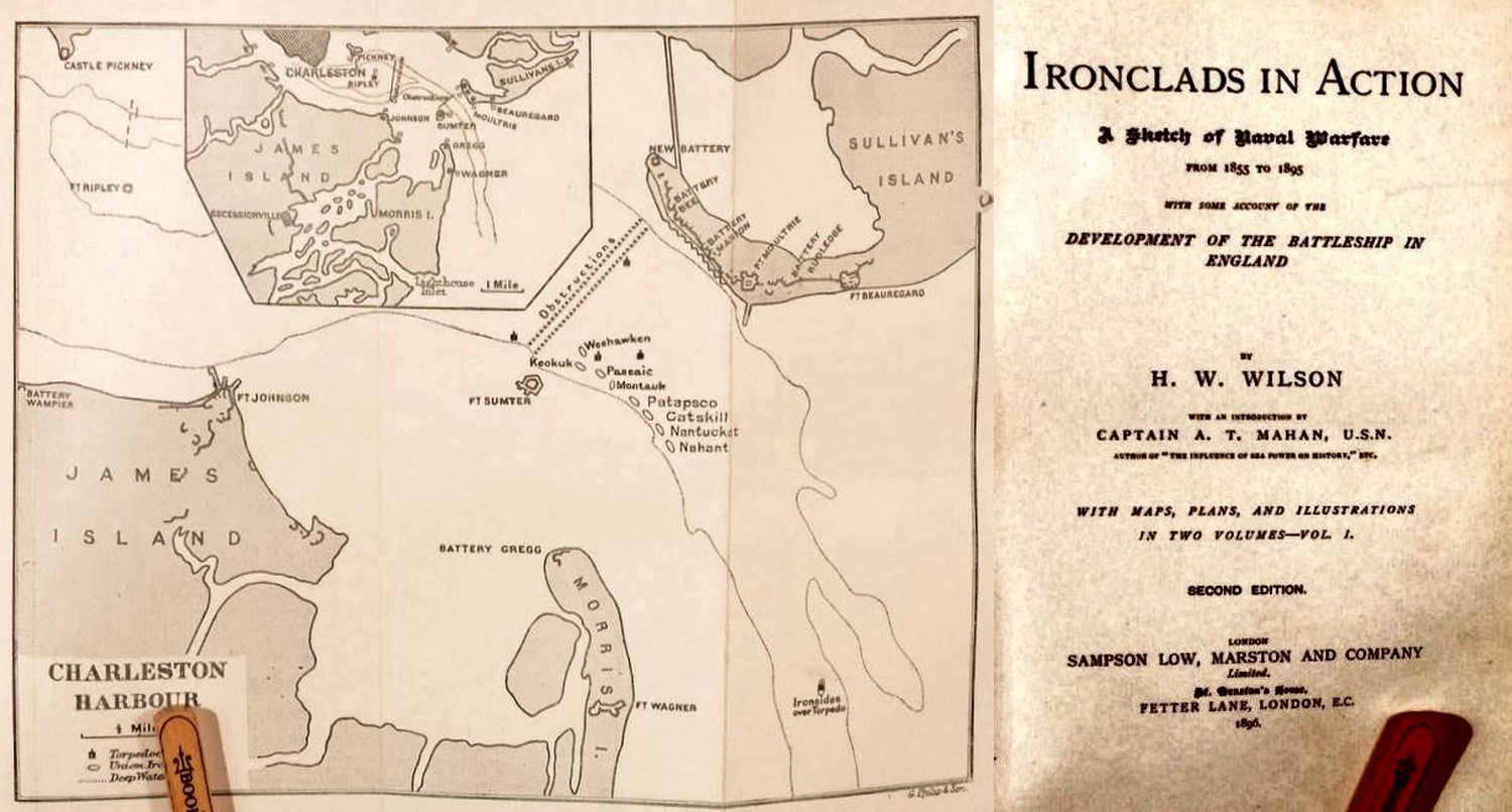 107k | "Panoramic View of Charleston Harbor. -- Advance of Ironclads to the Attack, 7 April, 1863" Line engraving published in "The Soldier in our Civil War", Volume II, page 172, with a key to individual ships and land features shown. U.S. Navy ships present are (from left to center): Keokuk, Nahant, Nantucket, Catskill, New Ironsides, Patapsco, Montauk, Passaic and Weehawken. | U.S. Naval Historical Center Photograph # NH 59269. | |