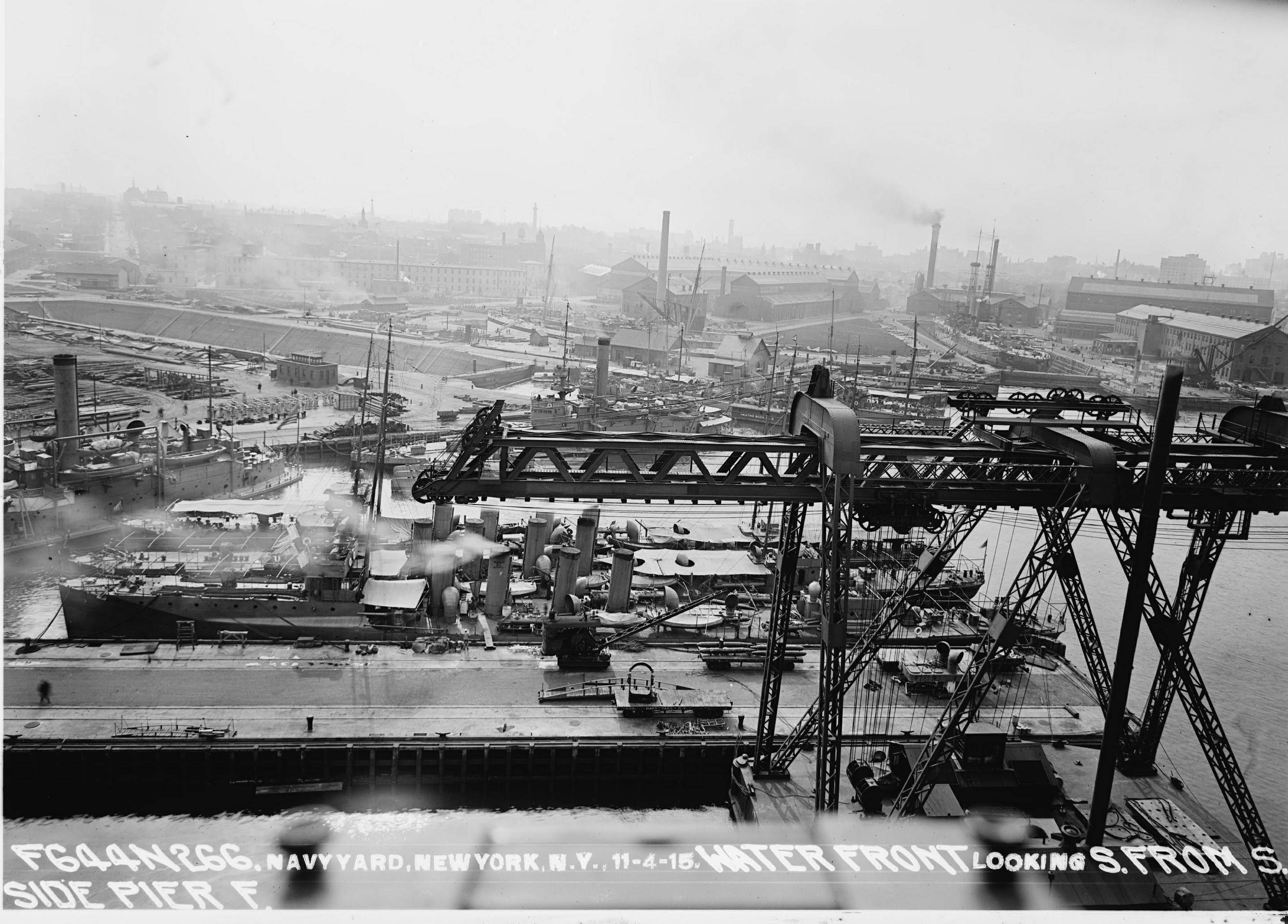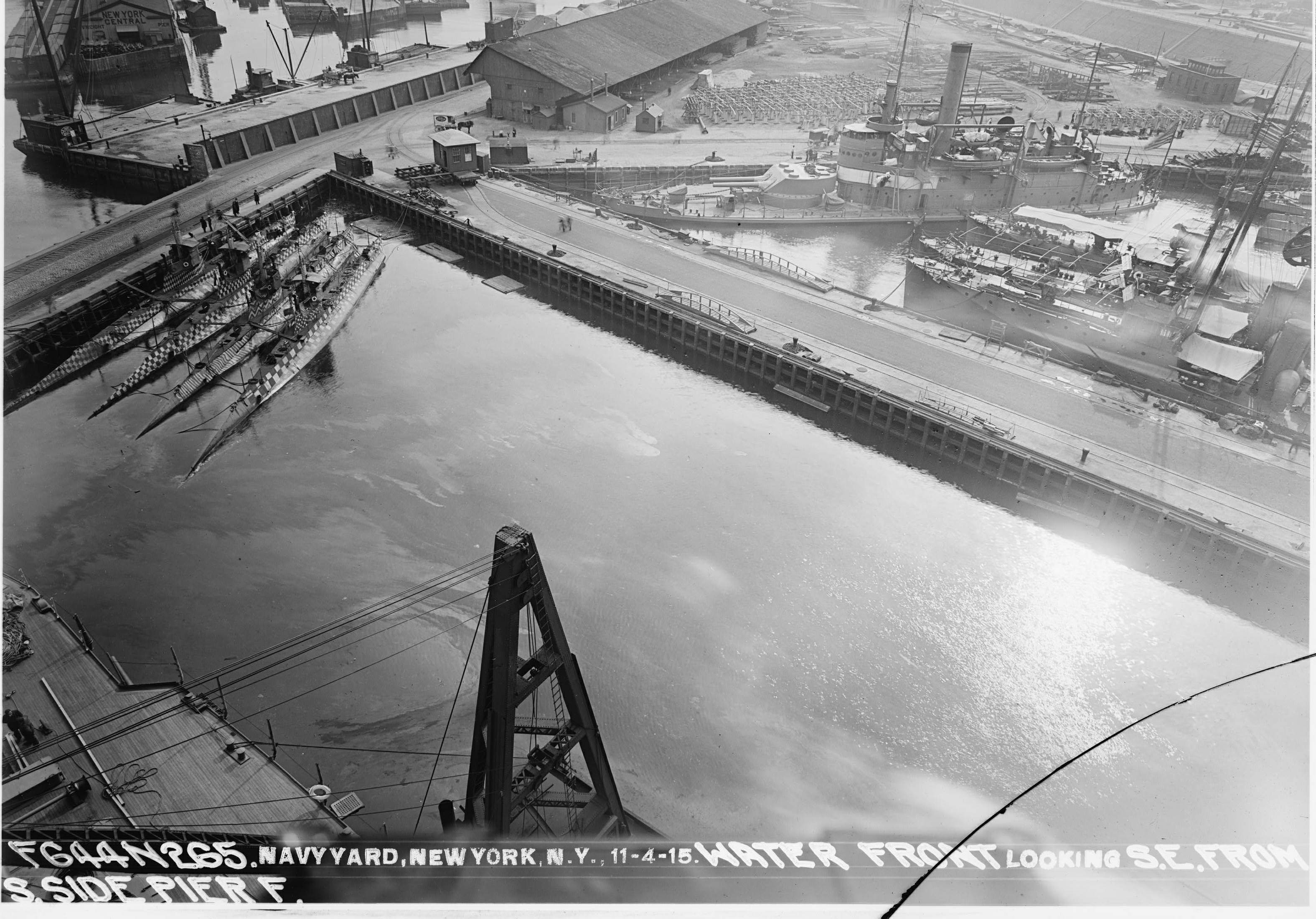 New York Navy Yard on 4 November 1915. Waterfront, Looking Southeast from South Side of Pier F: | Two former monitors, converted to submarine tenders appear one behind the other. The Tonopah (M-8) is most likely the 1st ship & the Ozark (M-7) the other. Their charges are 4 K class submarines in camouflage; (in no particular order that can be determined here) K-1 (SS-32), K-2 (SS-33), K-5 (SS-36) & K-6 (SS-37). What appear to be 3 submarines are moored port side of the Ozark in the photo here. National Archives Identifier: 6880309 | Agency-Assigned Identifier: F644 N266 Photo I.d. courtesy of Aryeh Wetherhorn & Ric Hedman. Photo courtesy of catalog.archives.gov ![]() 496k |