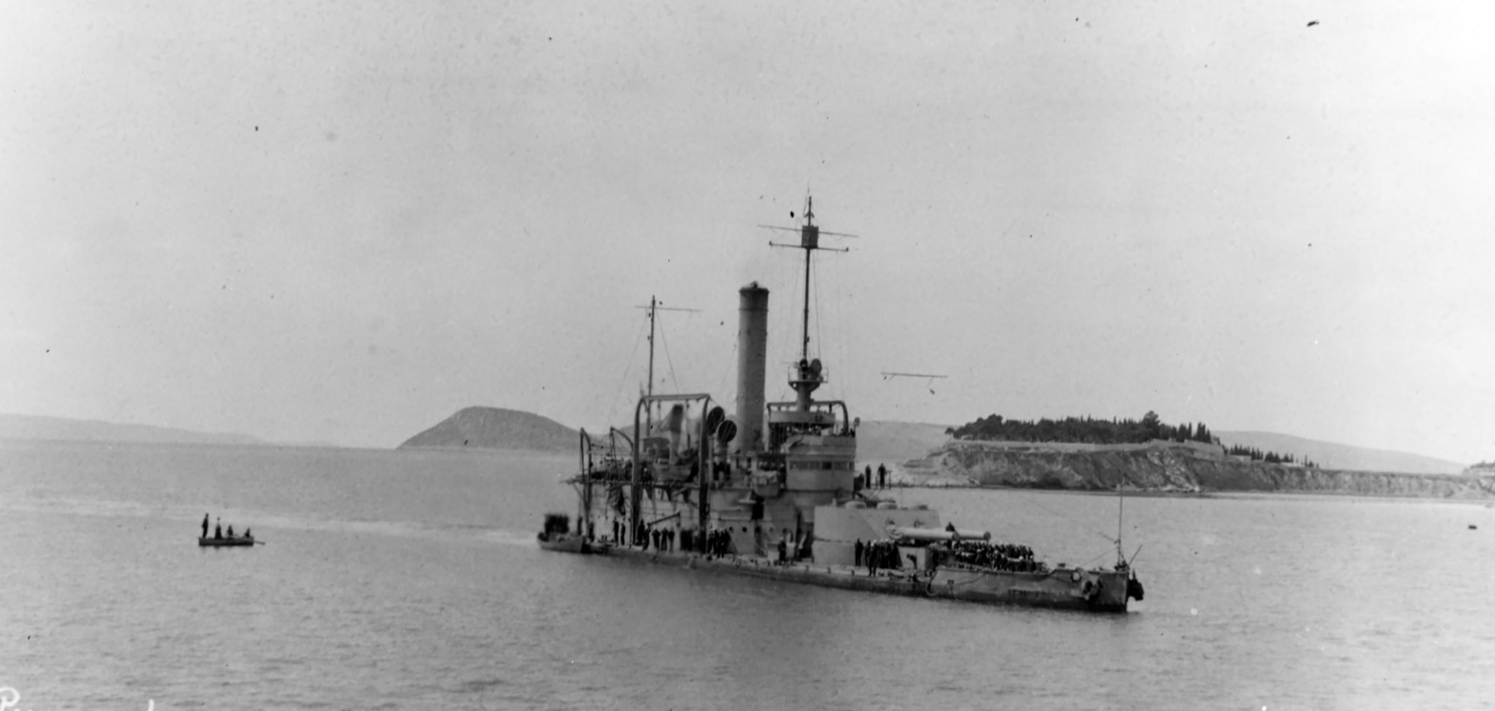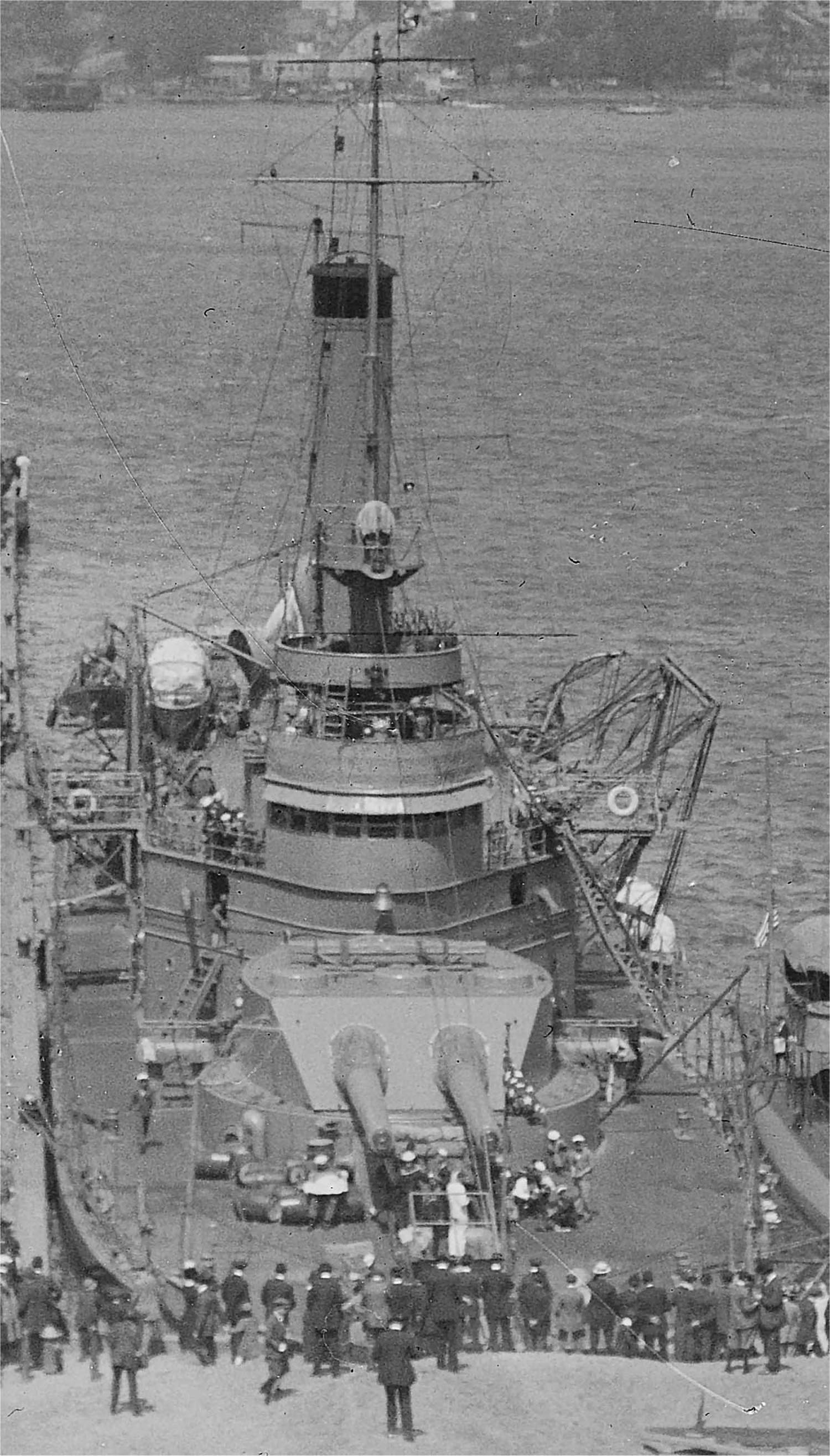 Tonopah (M-8) photographed circa 1919 by R.E. Wayne in what was then Spalato (today, Split, Croatia). In the background is a little hill named Sustipan (Sustjepan). | Text info courtesy of Zomudrin. | Naval History and Heritage Command Photo # NH 45434 from the National Museum of the U.S. Navy via flickr.com. ![]() 703k |