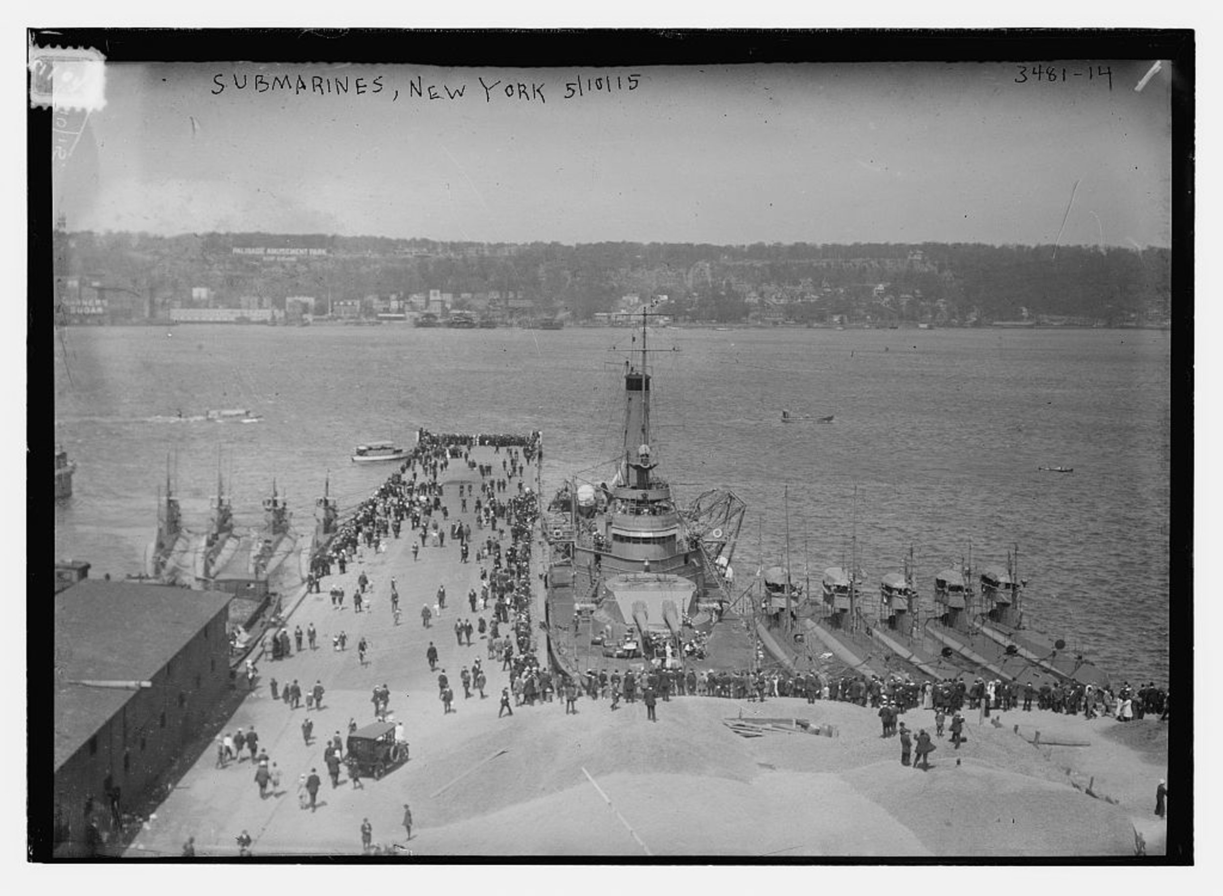 641k | GREAT CROWDS INSPECT FLEET AT NEW YORK Public interest in the naval review in the Hudson River has been vastly augmented by the disaster to the Lusitania. The picture shows the throng viewing the Tonopah (M-8) and awaiting passage on the boats that make the tour of the fleet. | Image and text provided by Penn State University Libraries; University Park, PA. Photo courtesy of Evening Public Ledger. (Philadelphia [Pa.]) 1914-1942, 11 May 1915, Night Extra, Image 1, via chroniclingamerica.loc.gov. ![]() 539k | "Eager crowds viewing the submarines at the foot of 135TH street with the Rhode Island (BB-17) in mid stream." | The submarine tender is the Tonopah (M-8). Photo i.d. courtesy of Ric Hedman. |