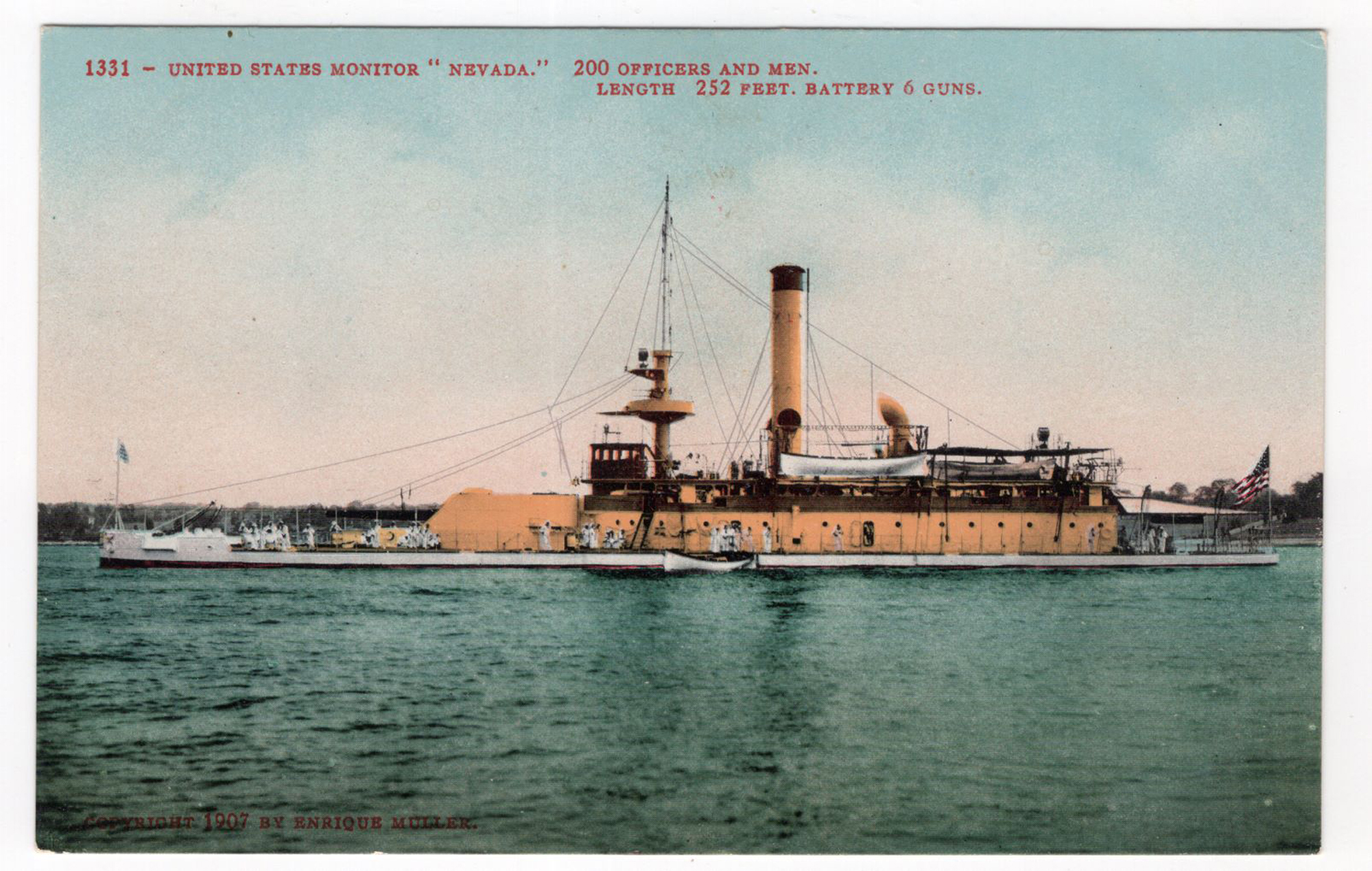 1.32k | U.S. Monitor Nevada (M-8), copyright by Enrique Muller in 1907. Divided back cards were manufactured between 1907 to 1915. Postcard manufacturer Edward H. Mitchell of San Francisco. | Photo courtesy of James Bass. | ||||||||||||||||||||||||||||||||||||||||||||||||||||||||