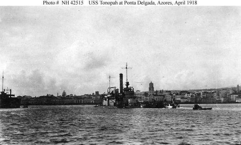 Tonopah (M-8) in the harbor at Ponta Delgada, Azores, in April 1918. She is painted in what appears to be Mackay type camouflage. Photo taken from Margaret (SP-527) by Raymond D. Borden.