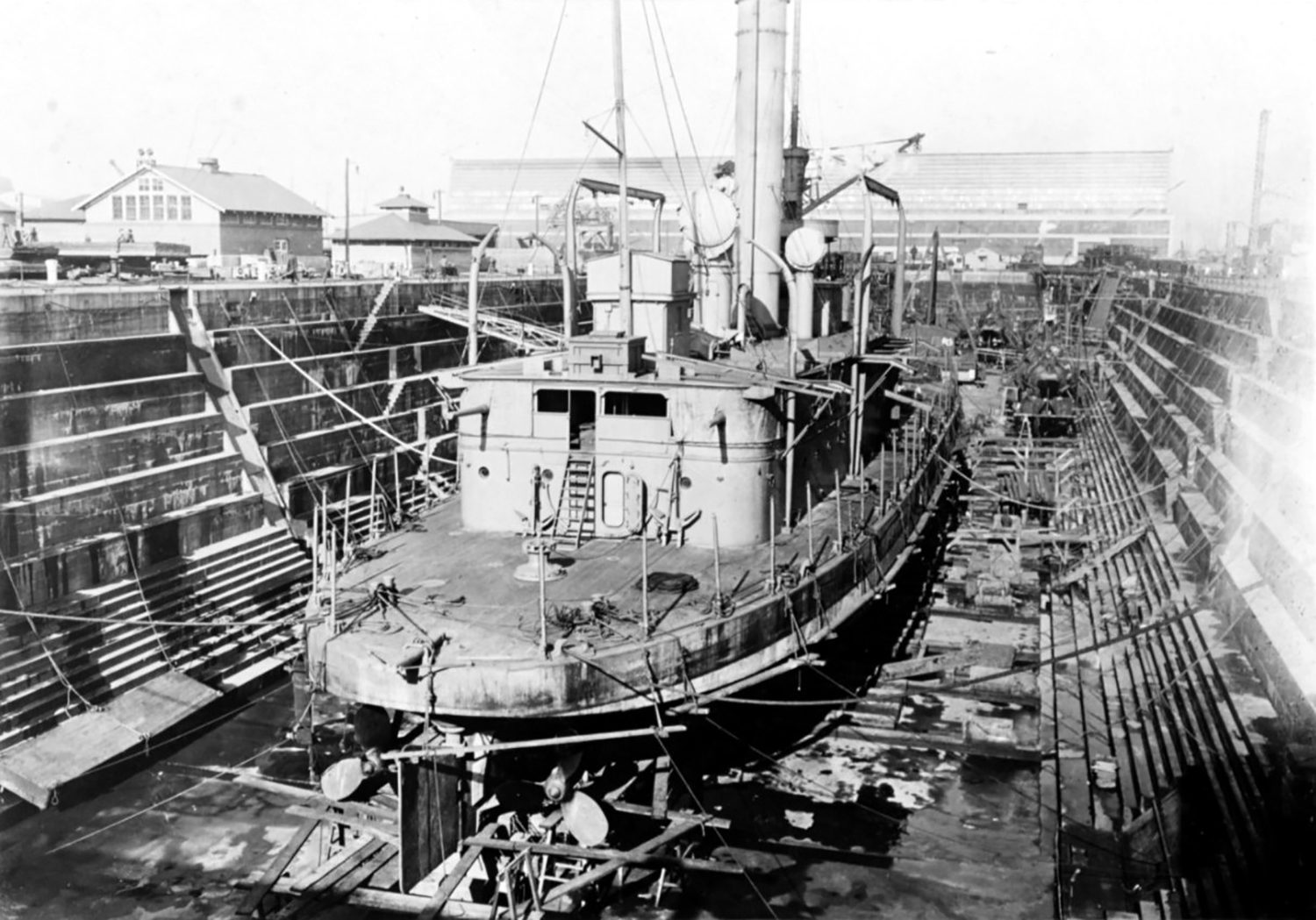 Tonopah (M-8) in Drydock No. 2 at the Philadelphia Navy Yard, December 1919. | Source: Naval History and Heritage Command, Photo No. NH 55115 via Mike Green. |