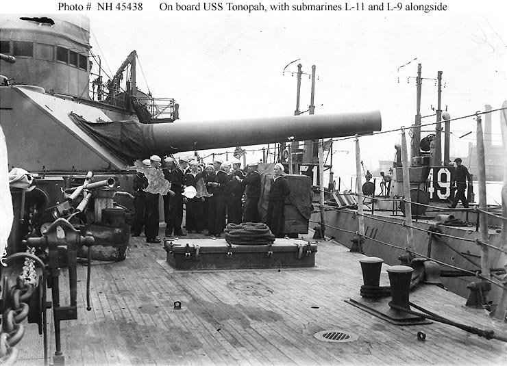 699k | Tonopah (M-8) with 2 submarines alongside in Galveston, Texas, August 1912. The submarine on the left is an E-boat (SS-24 /25), boat to the right is D-1 (SS-17). There are two unknown boats behind them. | Photo i.d. courtesy of Ric Hedmen. Photographer: Paul Verkin. National Archives Identifier: 45513822 Local Identifier: 165-WW-338B-64. Photo courtesy of catalog.archives.gov | ||||||||||||||||||||||||||||||||||||||||||||||||||||||||