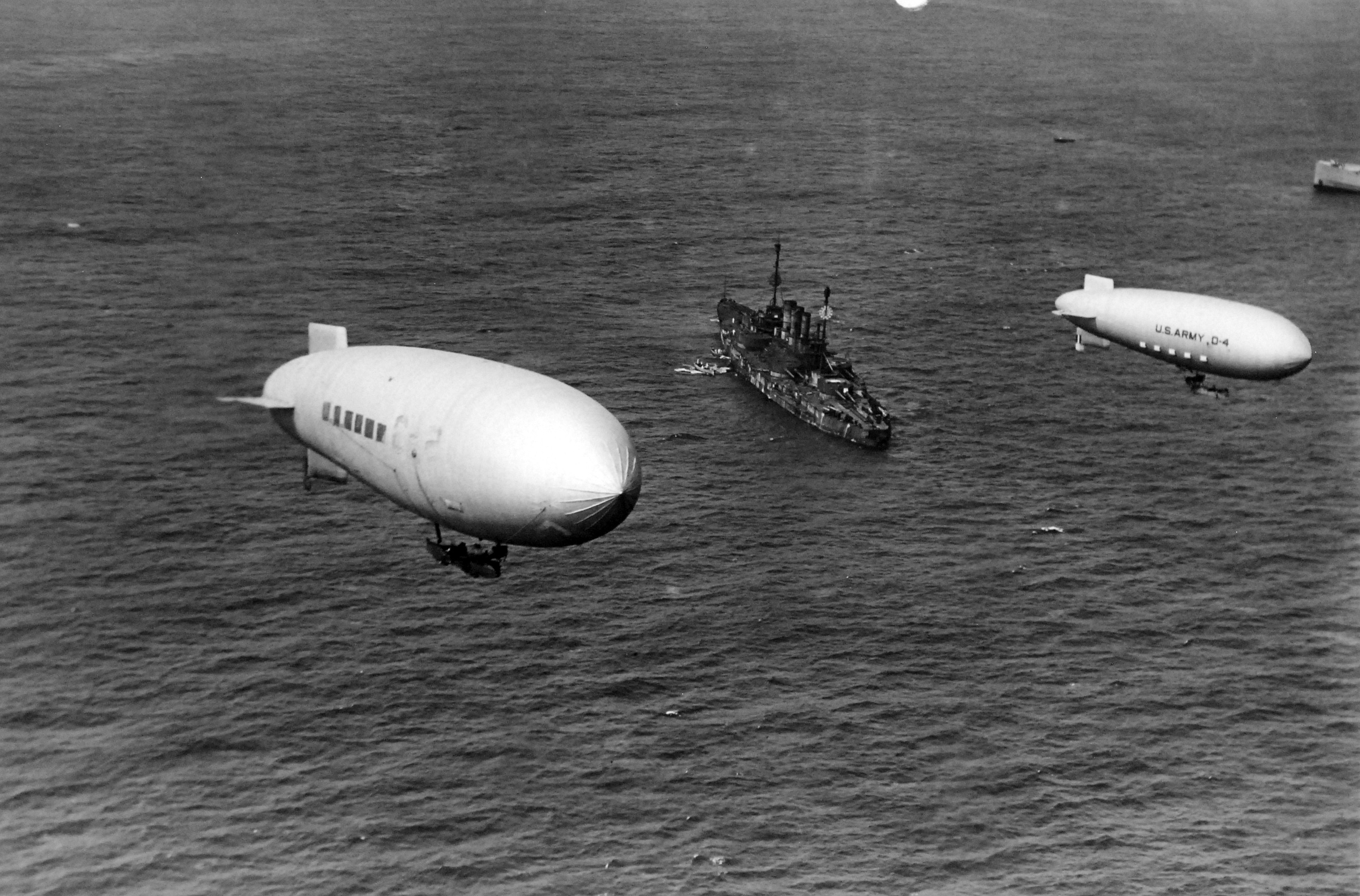 1.18k | Ostfriesland before being sunk during the Billy Mitchell aircraft bombing tests on German and U.S. Navy ships, showing the vulnerability of ships to aerial bombing, 18 July 1921. Note, U.S. Army C-4 lighter-than-air aircraft to the right. | USN photo # Lot-6080-8 from the William "Billy" Mitchell Collection courtesy of the National Museum of the U.S. Navy via flickr.com | |