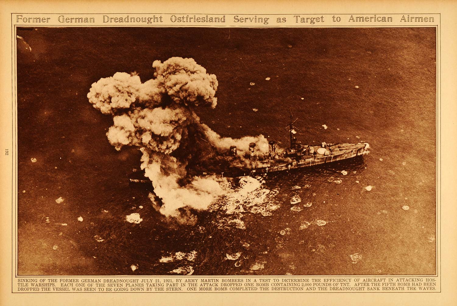 440k | Sepia rotogravure of the former German dreadnought Ostfriesland being destroyed by Army Martin bombers for practice. The caption writes, "Each one of the seven planes taking part in the attack dropped one bomb containing 2,000 pounds of TNT. After the fifth bomb had been dropped the vessel was seen to be going down by the stern. one more bomb completed the destruction and the dreadnought sank beneath the waves. | Photo courtesy of periodpaper.com | |