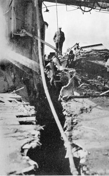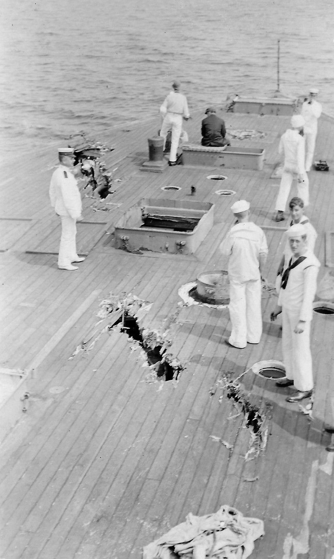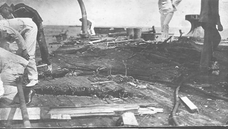 No plow ran this furrow - the deck of the San Marcos after being traversed by a heavy projectile. |