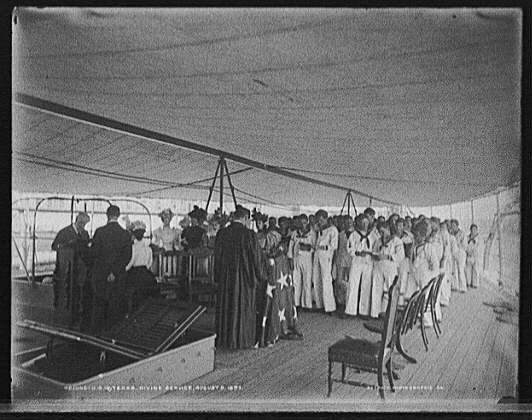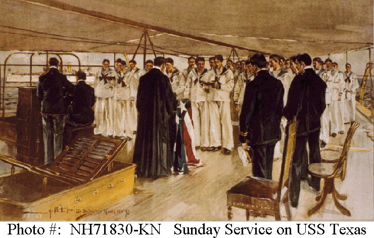 75k | "Assembling the Fleet at Key West -- Sunday Service on the Battleship Texas." Colored print after a painting by Howard Chandler Christy, March 1898, copyright 1898 by P.F. Collier. Ship in the left background is the cruiser New York. |