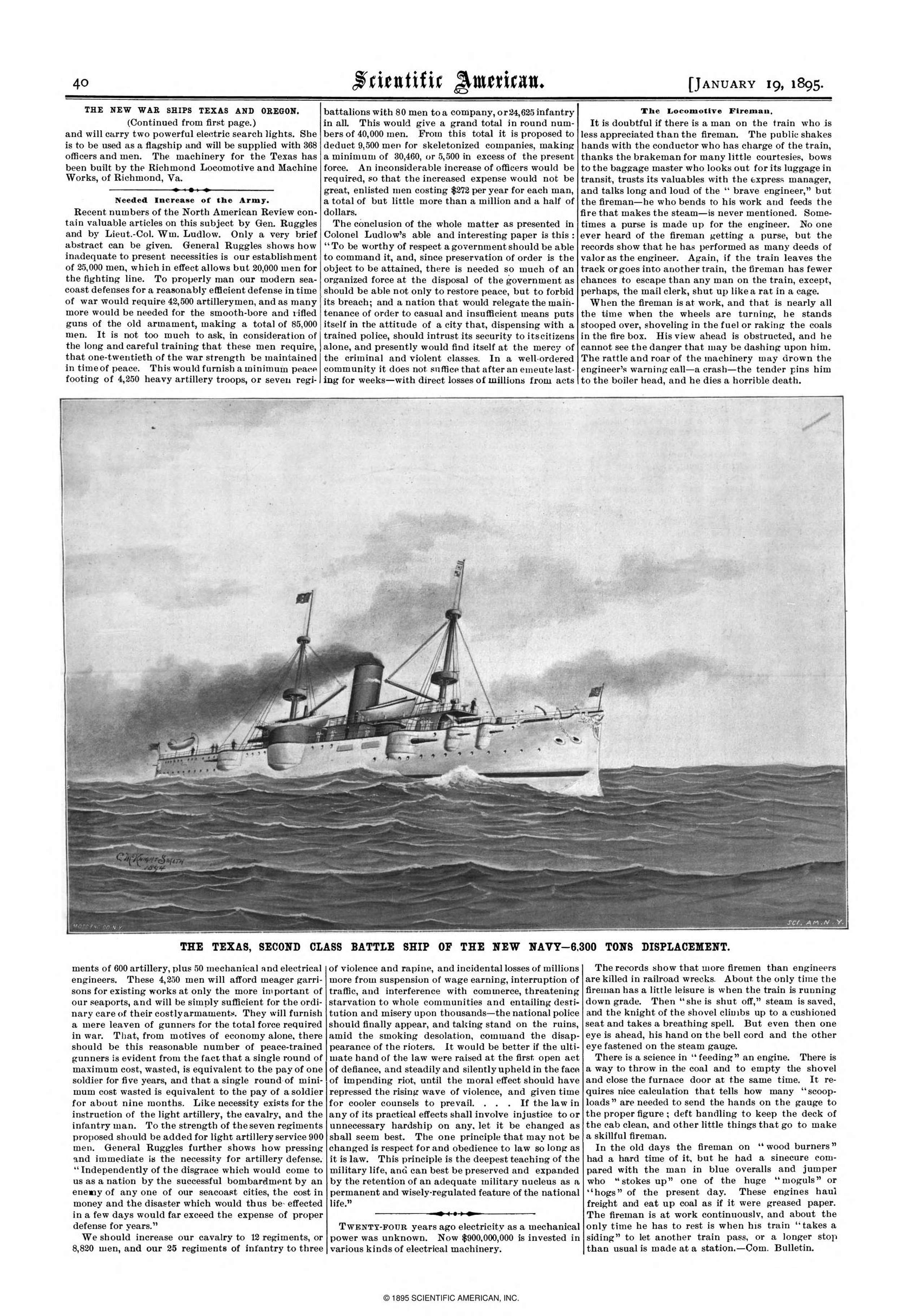 ![]() texas13 | 1.09k | Drawing of the Texas prior to her commissioning. | Image & text from the January 1895 edition of Scientific American, pg 40. Photo courtesy of scientificamerican.com via Daniel Hacker. |