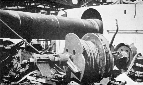 Damage on the San Marcos - This deck winch was blown over the 12-Inch gun from the other side of the deck. |