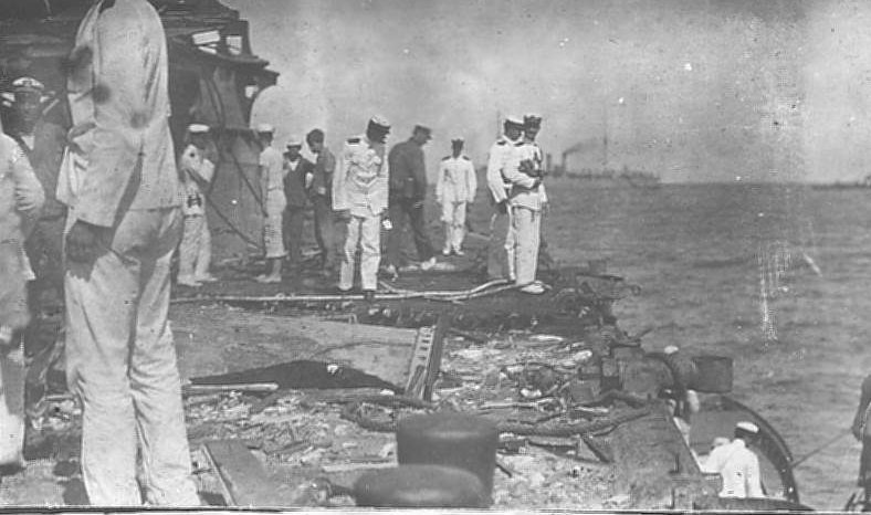 View of San Marcos, circa March 1911, showing the results of target practice, most likely from the Kansas (BB-21). The officers and crew are also most probably from the Kansas. |