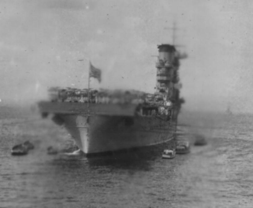 212k | USS Saratoga (CV-3) being assisted by tugs off Philadelphia Navy Yard circa late 1927–early 1928, shortly after being commissioned. National Naval Aviation Museum photo . |