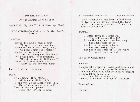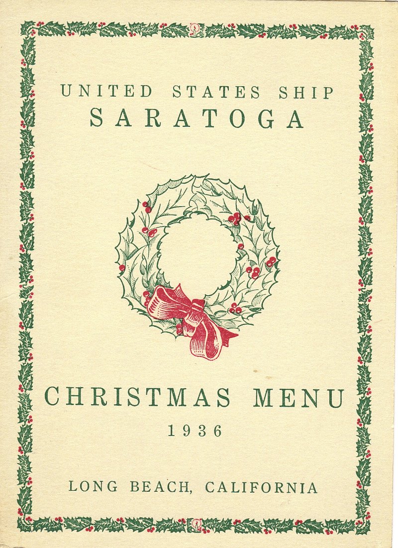 246k | USS Saratoga, "The Ship of Happy Landings," Christmas Menu, 1936. Long Beach, California. Commanding Officer was Captain William F. Halsey, Jr. Later, he was Commander, Third Fleet in the advance across the Pacific during World War II, and attained the rank of Fleet Admiral (the fourth and last officer to hold that rank). Executive Officer was Commander Frederick C. Sherman. A renowned leader of carrier task groups during World War II, he was awarded three Navy Crosses and attained the rank of Vice Admiral. |