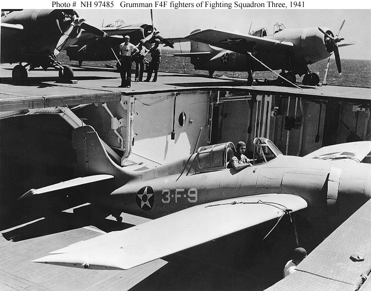 96k | Grumman F4F-3 Wildcat fighters, of Fighting Squadron Three (VF-3), on board USS Saratoga (CV-3) in early October 1941. Plane on the aircraft elevator is BuNo 3982 (3-F-9, later 3-F-15), piloted by Ensign Gayle Hermann. U.S. Naval Historical Center Photograph (# NH 97485). |