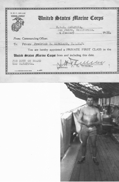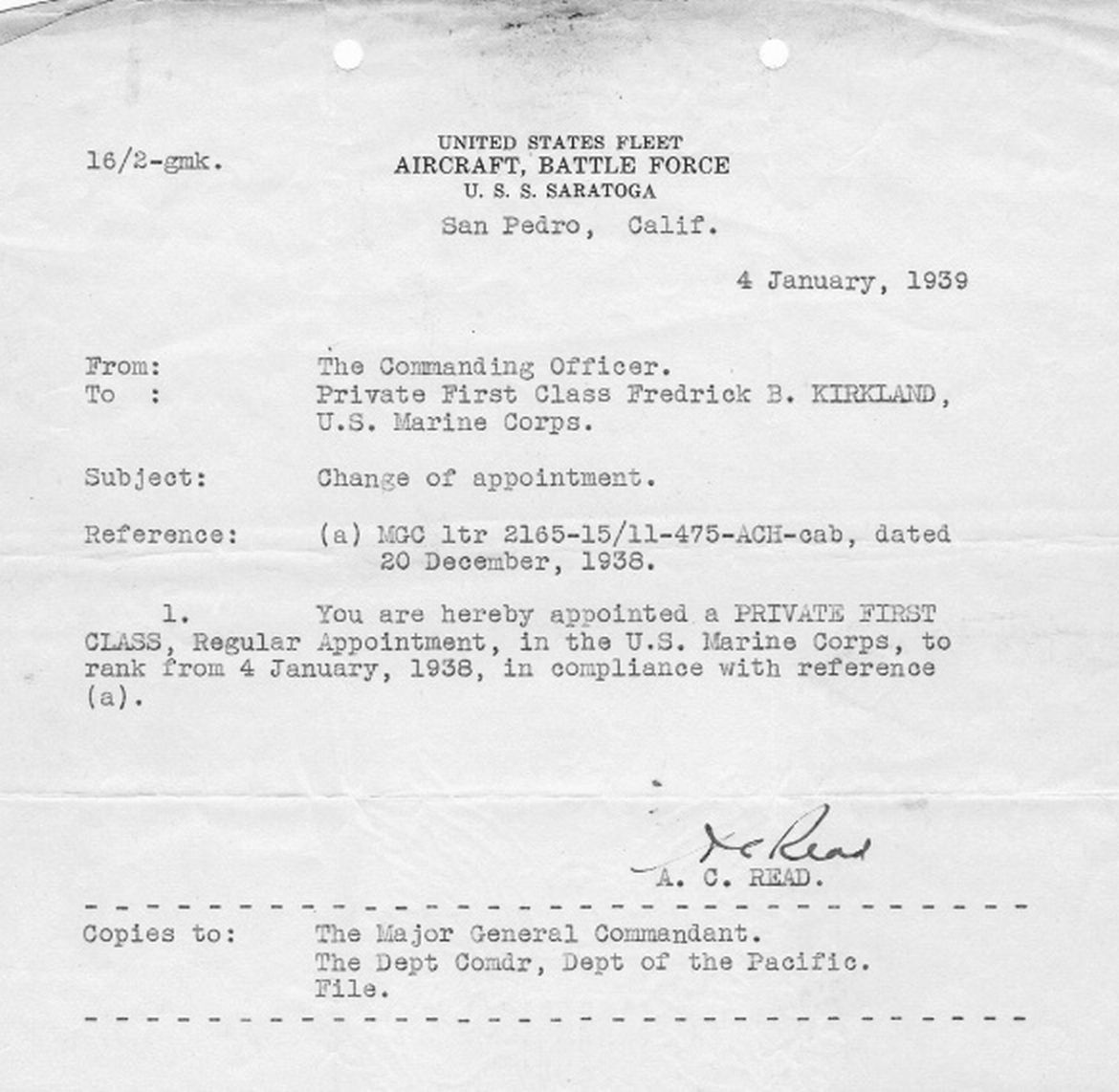 66k | Frederick B. Kirkland, aboard USS Saratoga (CV-3), was appointed a Private First Class in the United States Marine Corps on 4 January 1938. NS020365: Note signature of Captain John H. Towers. NS020365a: Note signature of Captain Albert C. Read. |
