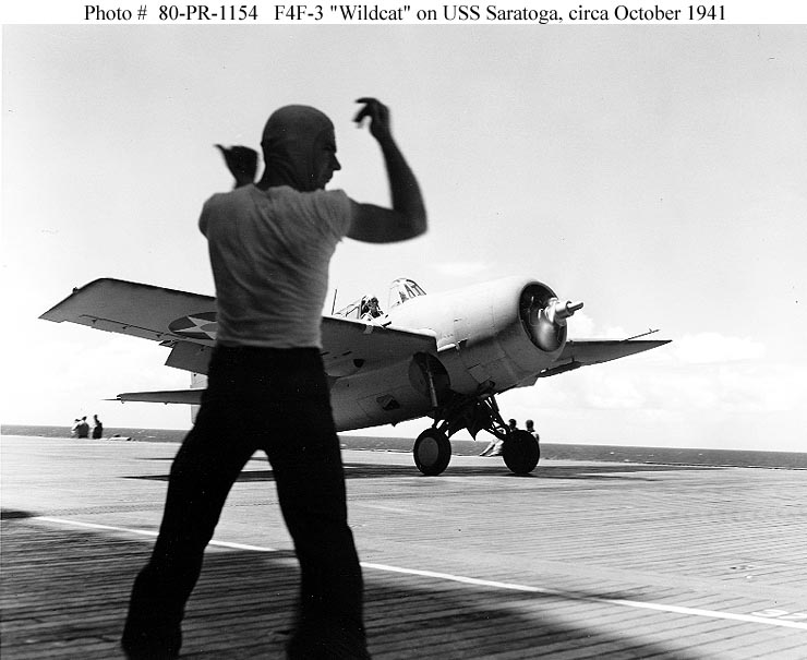 65k | A Grumman F4F-3 Wildcat of Fighting Squadron Three (VF-3) prepares to take off from USS Saratoga (CV-3), circa October 1941. The plane's pilot is probably LT John S. Thach, VF-3 Commanding Officer. Photograph from Department of the Navy collections in the U.S. National Archives (# 80-PR-1154). |