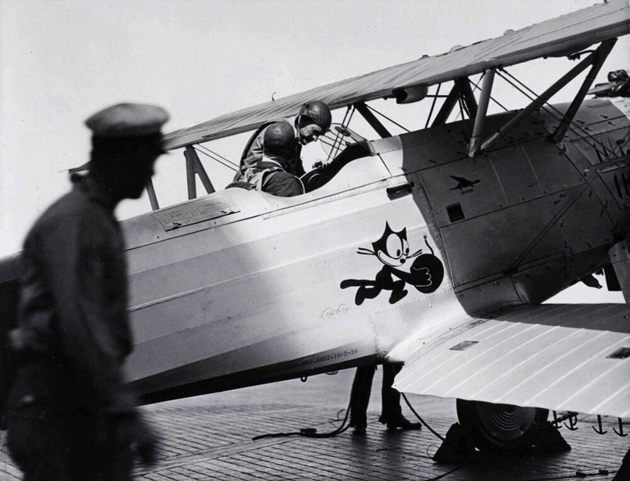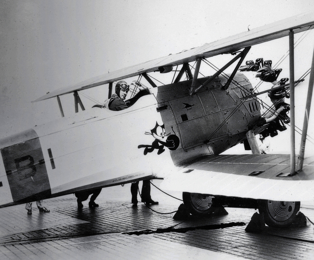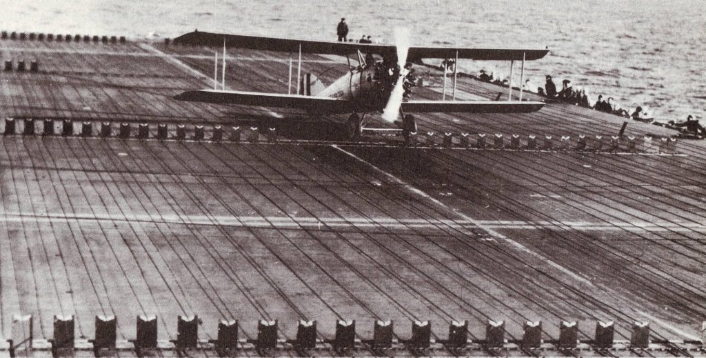 151k | A Chance Vought UO-1 piloted by LCDR Marc Mitscher makes the first landing aboard the aircraft carrier USS Saratoga (CV-3). The fore-and-aft arresting wires were engaged by a "comb" between the aircraft's wheels. The "fiddle bridges" held the wires off the flight deck. Athwartship wires which were snagged by an arresting hook on the aircraft were in simultaneous use. The fore-and-aft wires were soon abandoned. U.S.Navy photo. |