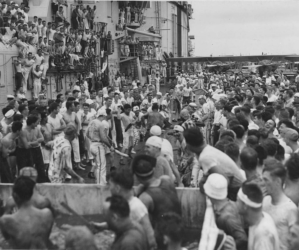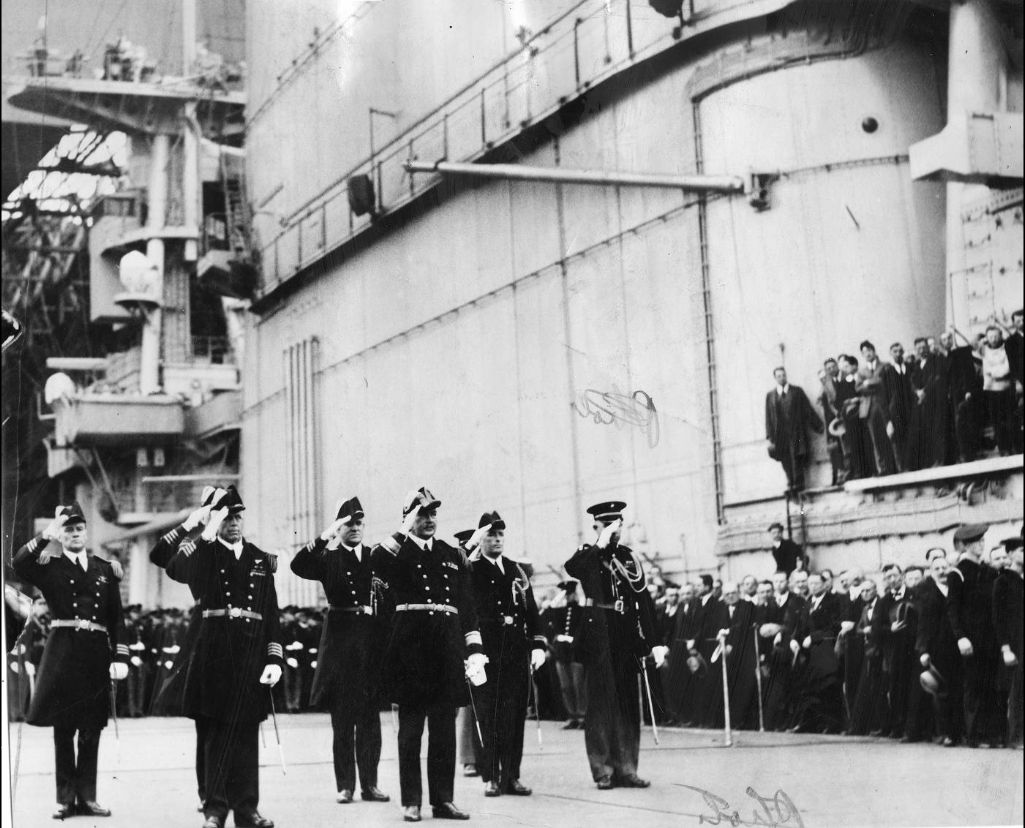 105k | Captain Albert C. Read, USN, Commanding Officer, USS Saratoga (CV-3) inspects the ship's Marines during change of command ceremonies, 15 March 1940. Captain Robert P. Molten, USN, the new CO, is visible over Read's right shoulder, also wearing a "fore and aft" hat. Collection of Vice Admiral Dixwell Ketcham, USN. U.S. Naval Historical Center Photograph (# NH 95723). |