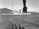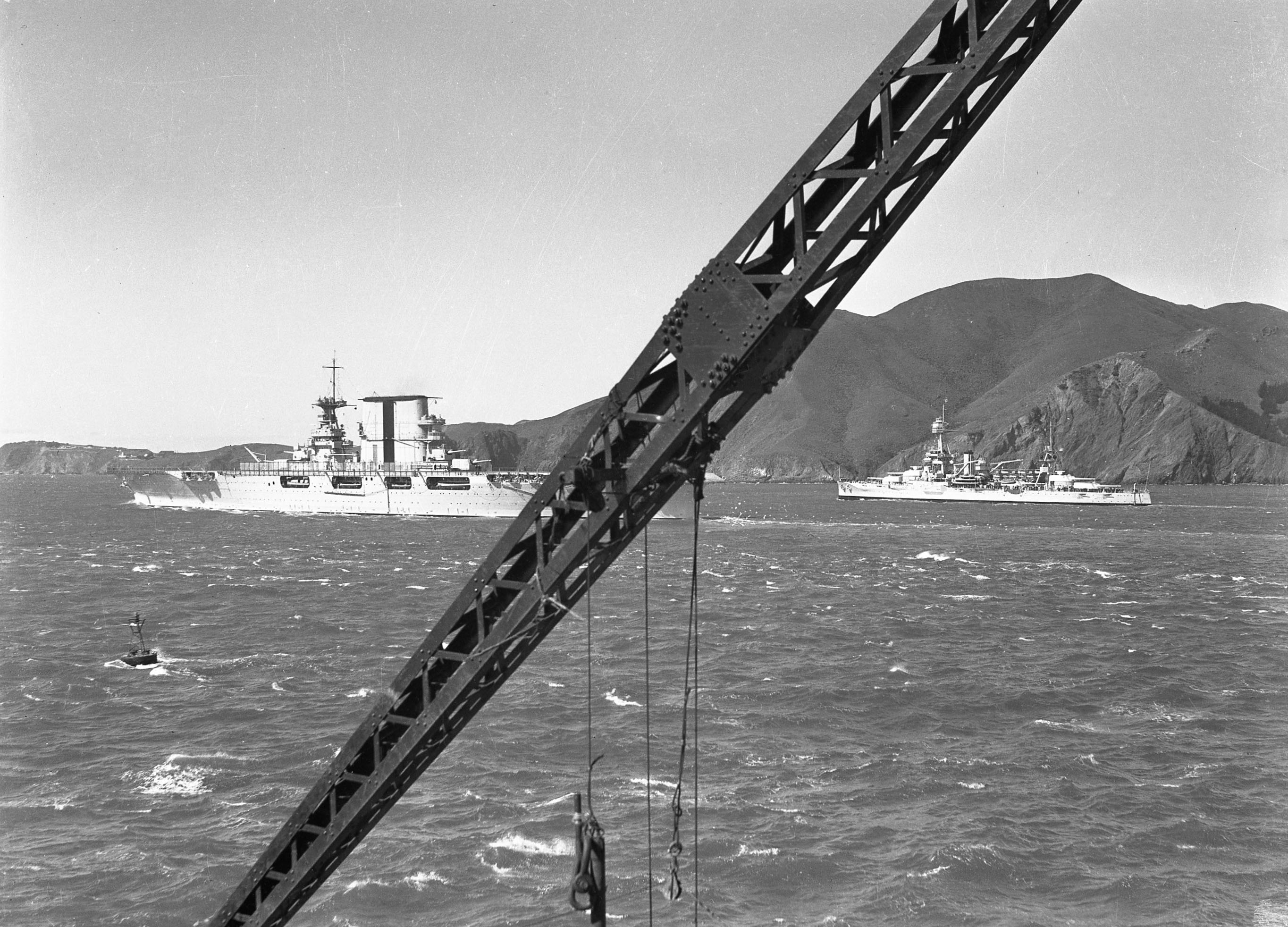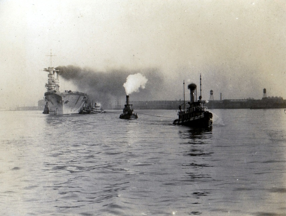 318k | Tugs ease Saratoga (CV-3) down the Delaware River to the Navy drydock. National Naval Aviation Museum, photo # 1996.488.011.007. |
